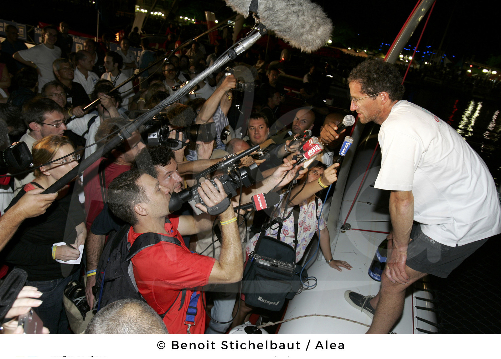 Description | SAILING - ROUTE DU RHUM LA BANQUE POSTALE 2006 - FINISH POINTE A PITRE (FRA) GUADELOUPE - 7/11/2006.PHOTO : BENOIT STICHELBAUT / ALEA.ORMA CLASS - GEANT / SKIPPER: MICHEL DESJOYEAUX (FRA) / 4TH / FACING THE MEDIAS |