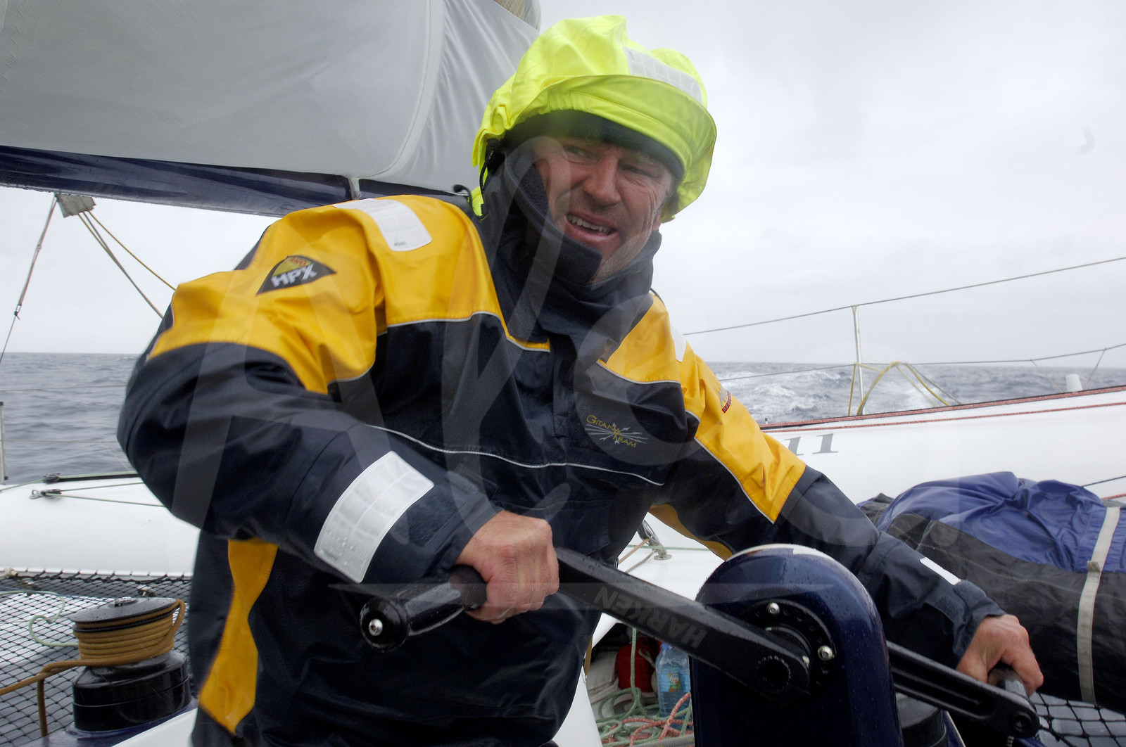 | Description | Images embarquées avec Lionel Lemonchoix avant la route du Rhum 2006, par gros temps sur le multicoque GITANA 11 - le 3 Septembre 2006, en Bretagne Sud - Photo Yvan Zedda / Alea.. |