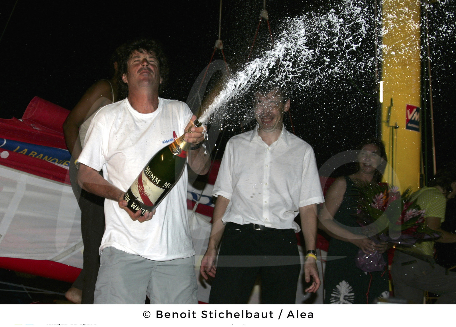 | Description | SAILING - ROUTE DU RHUM LA BANQUE POSTALE 2006 - FINISH POINTE A PITRE (FRA) GUADELOUPE - 11/11/2006.PHOTO: BENOIT STICHELBAUT / ALEA.IMOCA - VM MATERIAUX / SKIPPER: JEAN LE CAM (FRA) / 2ND / CELEBRATING WITH MUMM CHAMPAGNE |