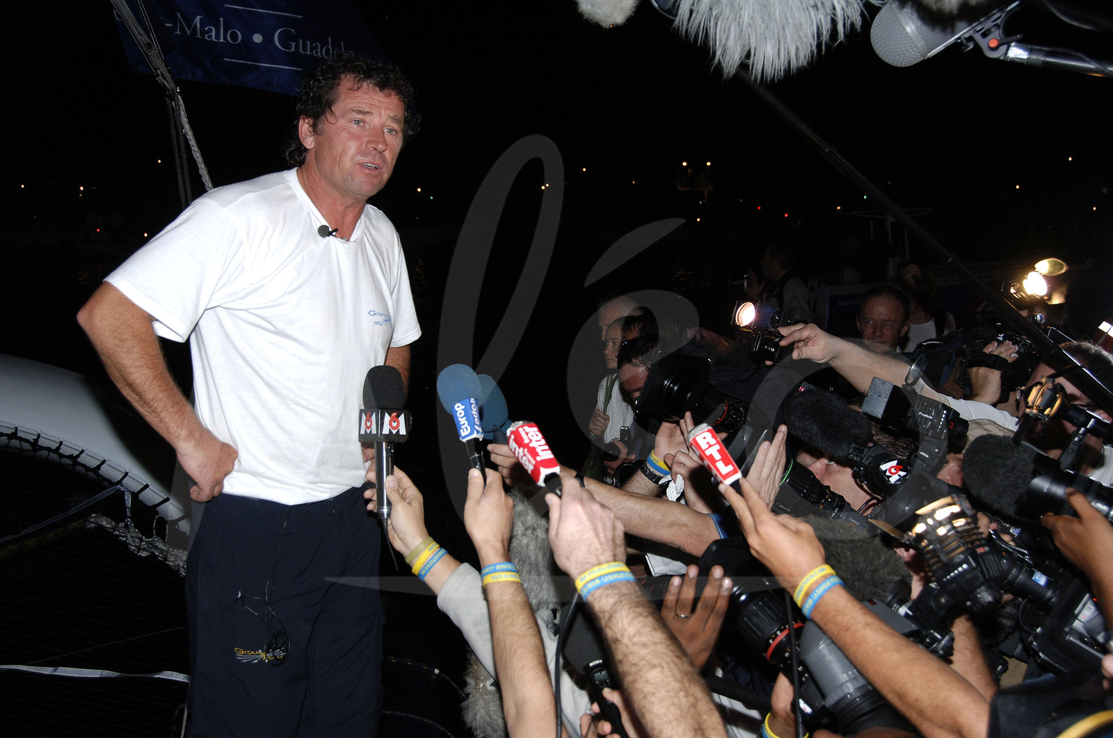 | Description | Arrivée victorieuse de Lionel Lemonchoix dans la route du Rhum 2006, sur le multicoque GITANA 11 - record battu en 7j 17h 19mn 6s, le 6 Novembre 2006, à Pointe à Pitre, Guadeloupe - Photo Yvan Zedda / Alea.. |
