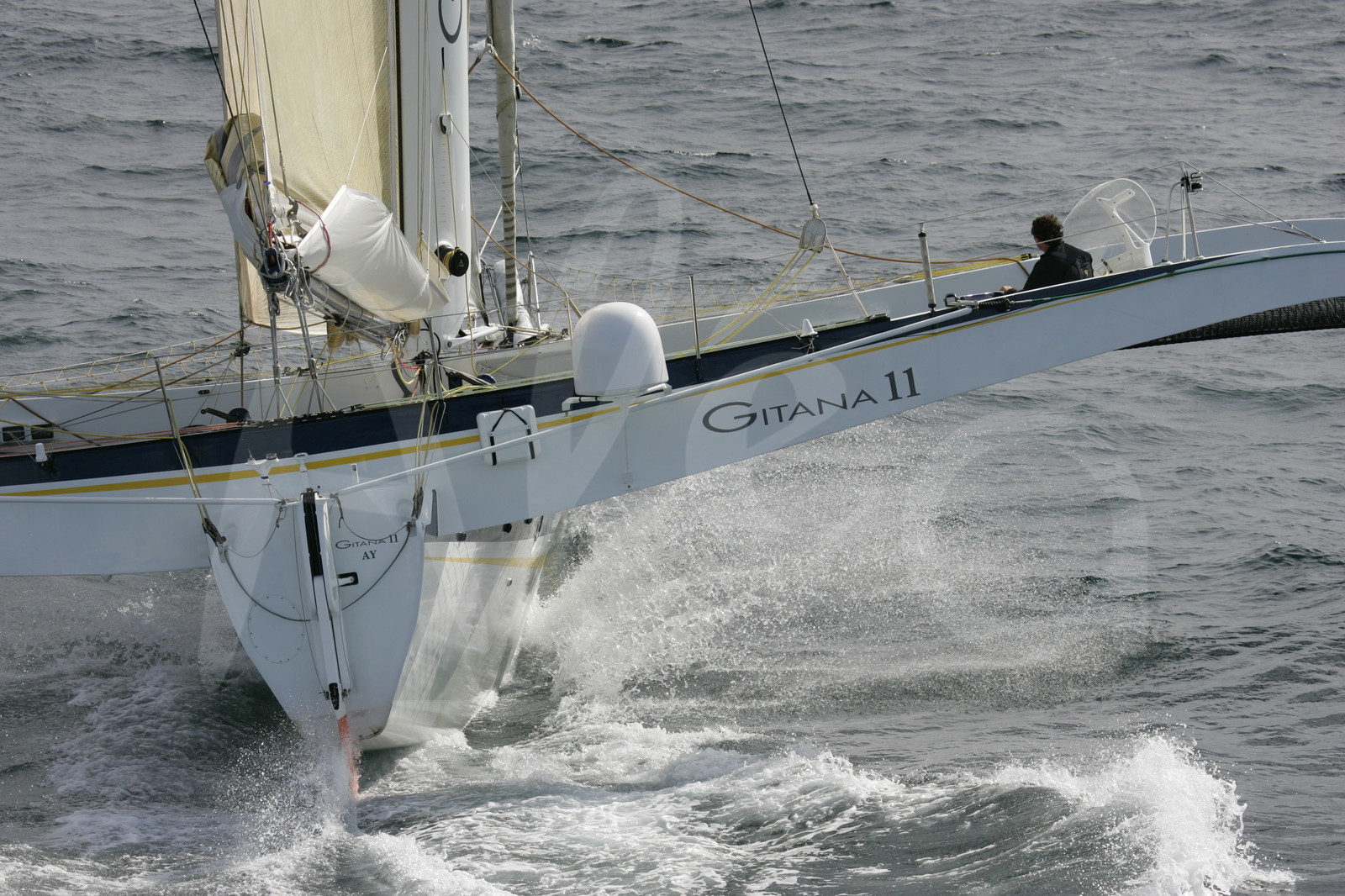 Description | ROUTE DU RHUM 2006.TRIMARAN 60' GITANA 11 - SKIPPER : LIONEL LEMONCHOIS.LE 27 SEPTEMBRE 2006.© B.STICHELBAUT / Alea |