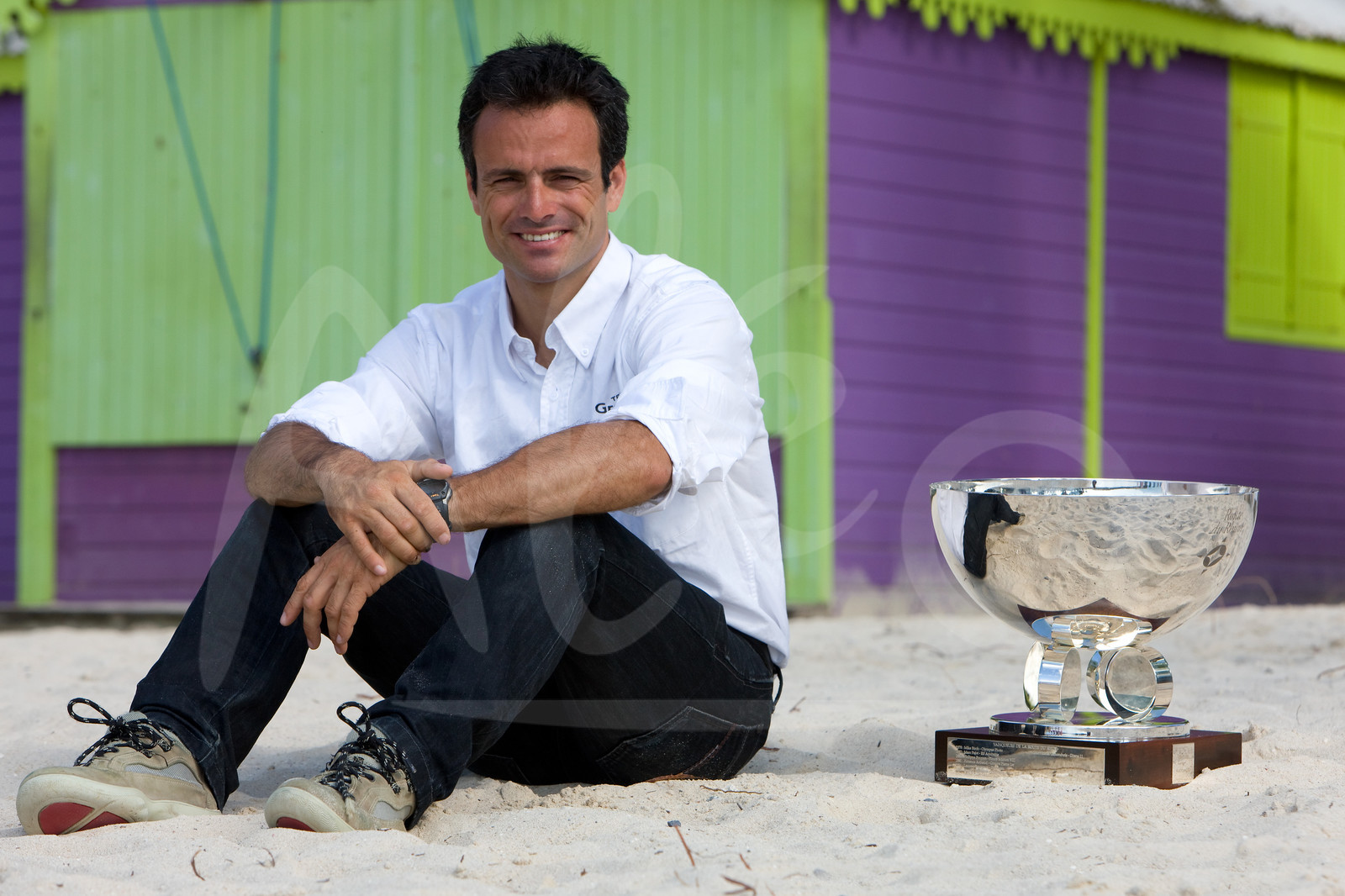 Description | SAILING - ROUTE DU RHUM 2010 - 16/11/2010 - POINTE A PITRE (GUADELOUPE - FRA) BEACH OF CREOLE HOTEL - PHOTO : JEAN MARIE LIOT / ALEA - FRANCK CAMMAS WITH THE TROPHY |