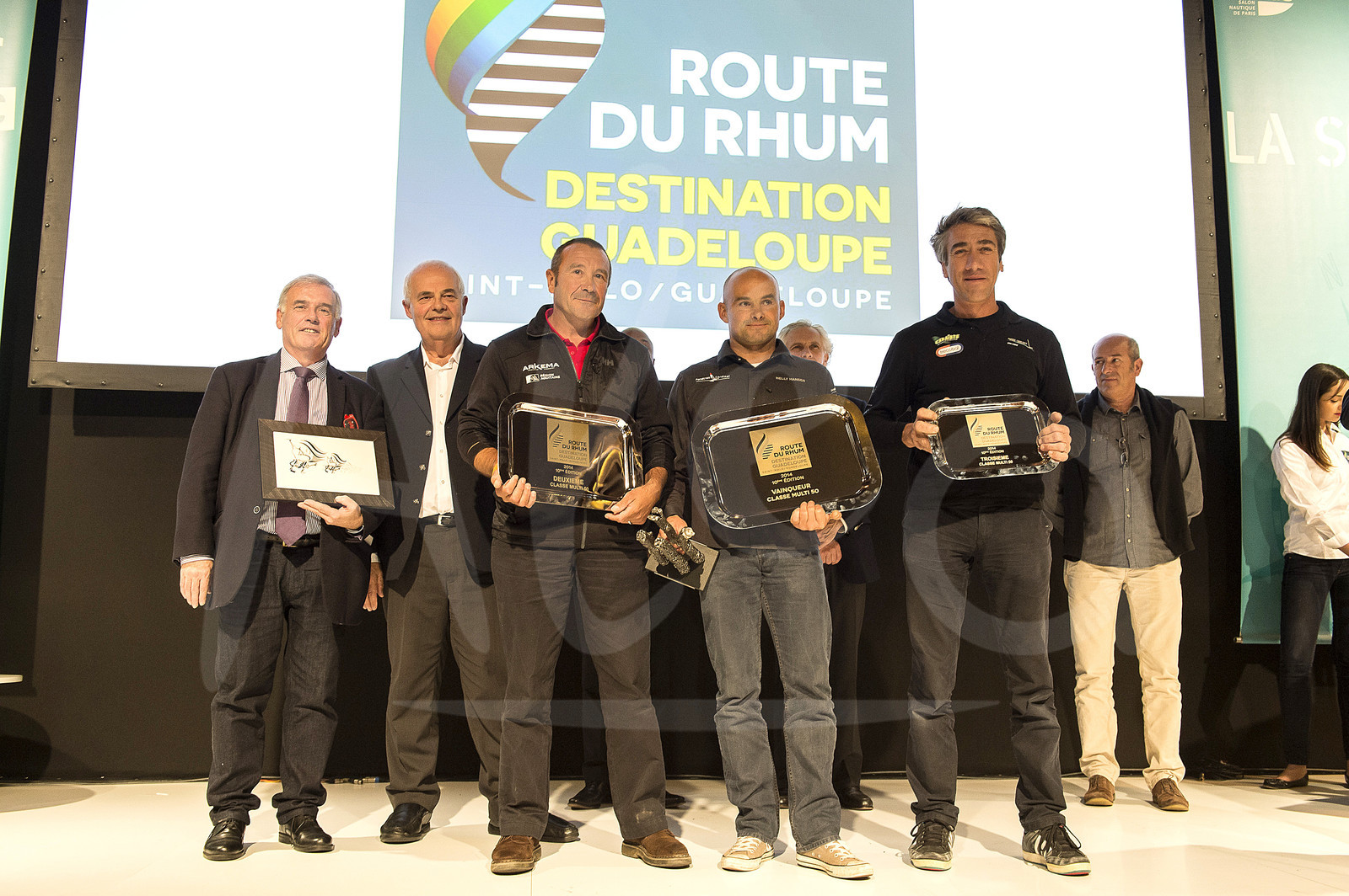 Description | Multi 50 podium with Lalou Roucayrol (2nd), Erwan Le Roux (1st), Gilles Lamire (3rd) and officials during the Route du Rhum 2014 prize ceremony at the NAUTIC show in Paris (France) on december 06, 2014 - Photo Olivier Blanchet / ALEA |