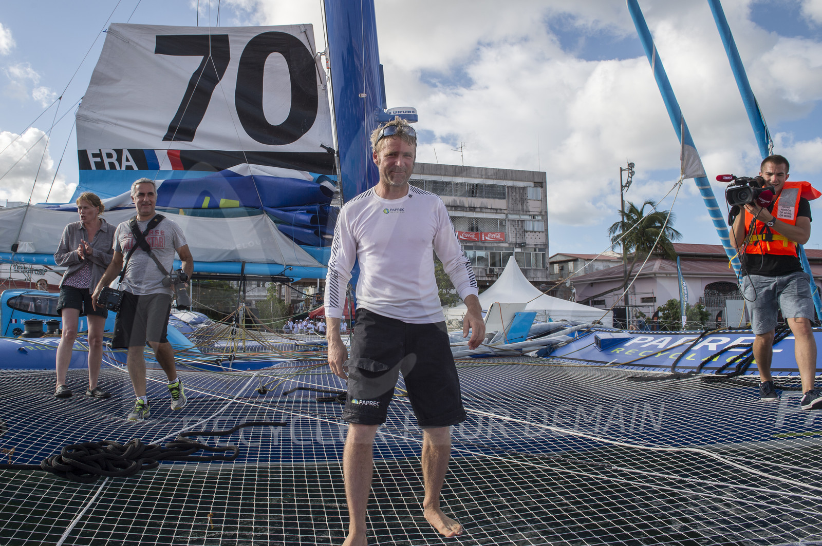 Description | Yann Elies, skipper of the Multi70 trimaran Paprec Recyclage, Ultime category, finishes 7th (seventh) in the Route du Rhum Destination Guadeloupe, in Pointe ‡ Pitre, Guadeloupe, on november 11, 2014 - Photo Olivier Blanchet / ALEA |