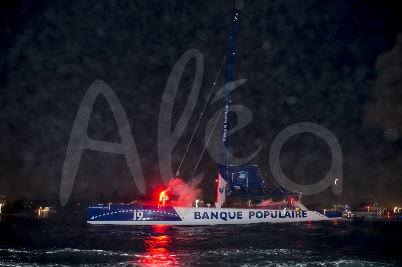 Description | Loick Peyron, skipper of the maxi trimaran Banque Populaire VII, Ultime category, breaks the historical record and wins the Route du Rhum Destination Guadeloupe in 7d 15h 8mn 32s, in Pointe ‡ Pitre, Guadeloupe, on november 10, 2014 - Photo Olivier Blanchet / ALEA |