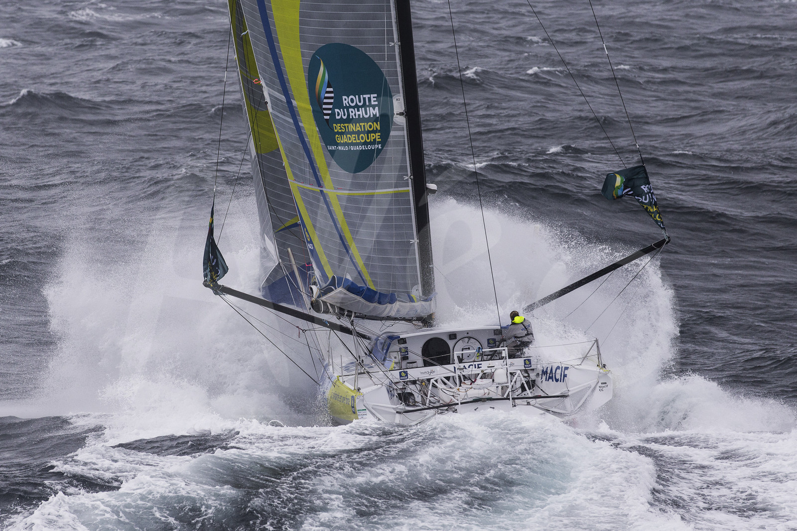 Description | Aerial view of the IMOCA MACIF with french skipper Francois Gabart training in bad weather off Groix Island, south brittany, prior to the Route du Rhum Destination Guadeloupe on october 06, 2014 - Photo Jean Marie Liot / ALEA |
