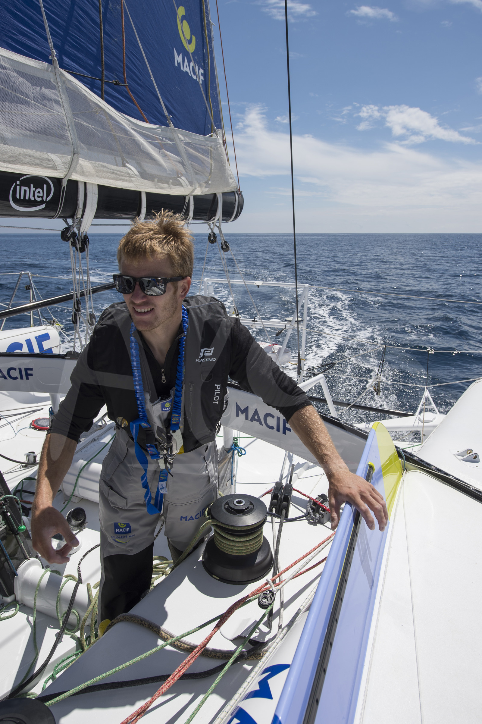 Description | French skipper Francois Gabart onboard the IMOCA MACIF training for the Route du Rhum off Port La Foret, Brittany, on july 19, 2014 - Photo Olivier Blanchet / ALEA |