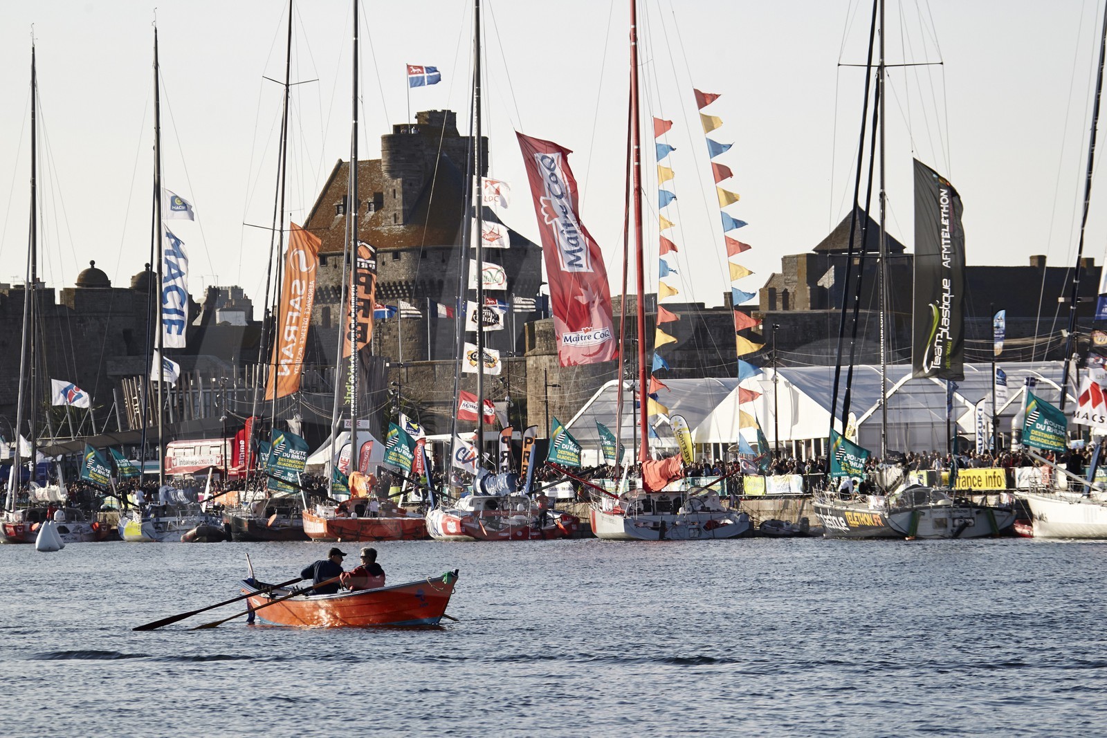 Description | France, Ille-et-VIllaine (35), Côte d'Emeraude, Saint-Malo, voiliers à quai devant la ville fortifiée avant le départ de la Route du Rhum 2014 - Photo Benoit Stichelbaut / Alea |