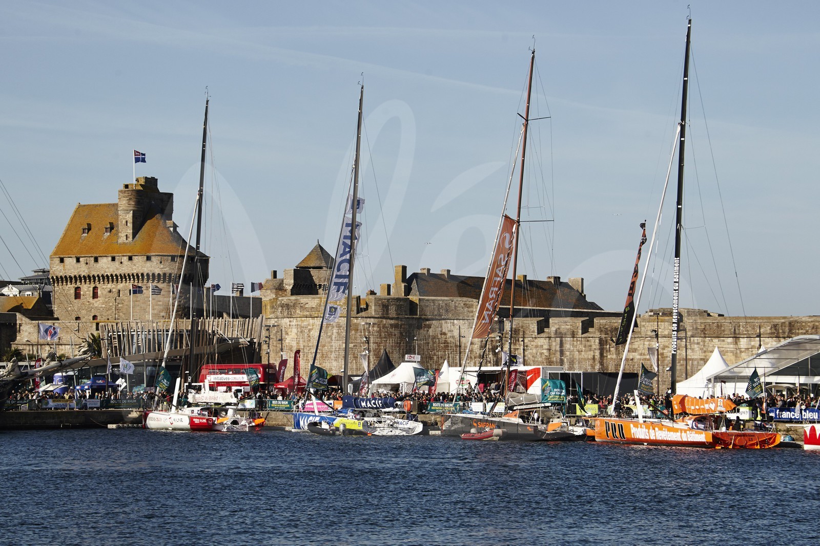 Description | France, Ille-et-VIllaine (35), Côte d'Emeraude, Saint-Malo, voiliers à quai devant la ville fortifiée avant le départ de la Route du Rhum 2014 - Photo Benoit Stichelbaut / Alea |