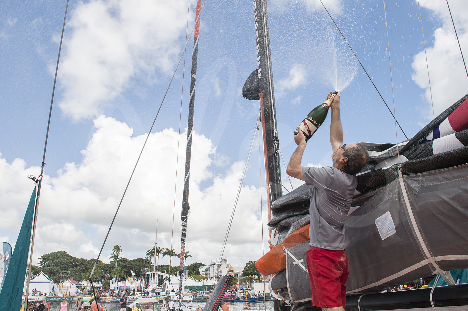 Description | Marc Guillemot, skipper of the monohull SAFRAN, Class IMOCA category, celebrates with champagne after finishing third (3rd) of the Route du Rhum Destination Guadeloupe in Pointe ‡ Pitre, Guadeloupe, on november 15, 2014 - Photo Olivier Blanchet / ALEA |