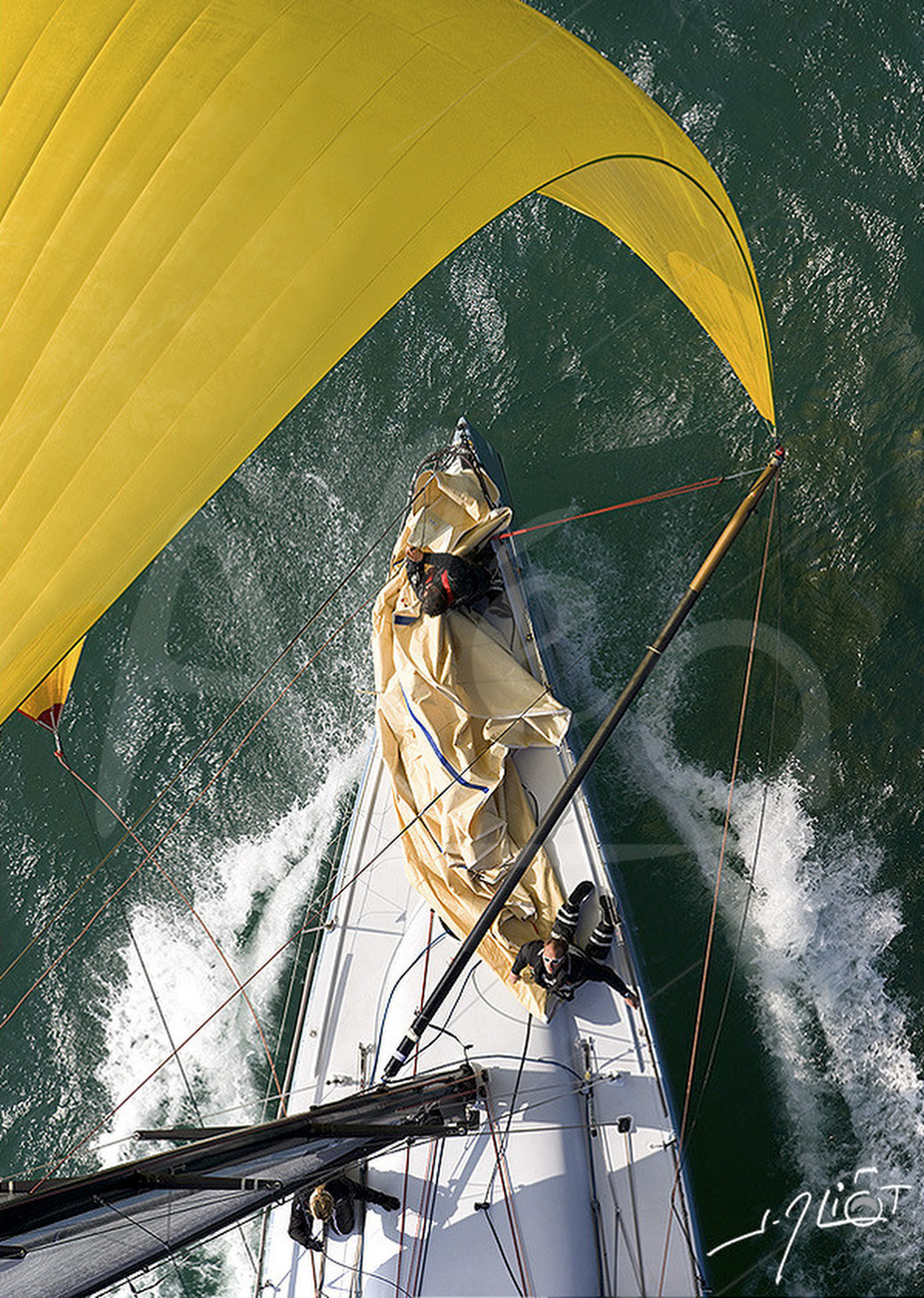 Description | Spi Ouest-France 2012 - La Trinité-sur-Mer le 6/04/2012. .Spi jaune aérien.© Jean-Marie LIOT / Alea |