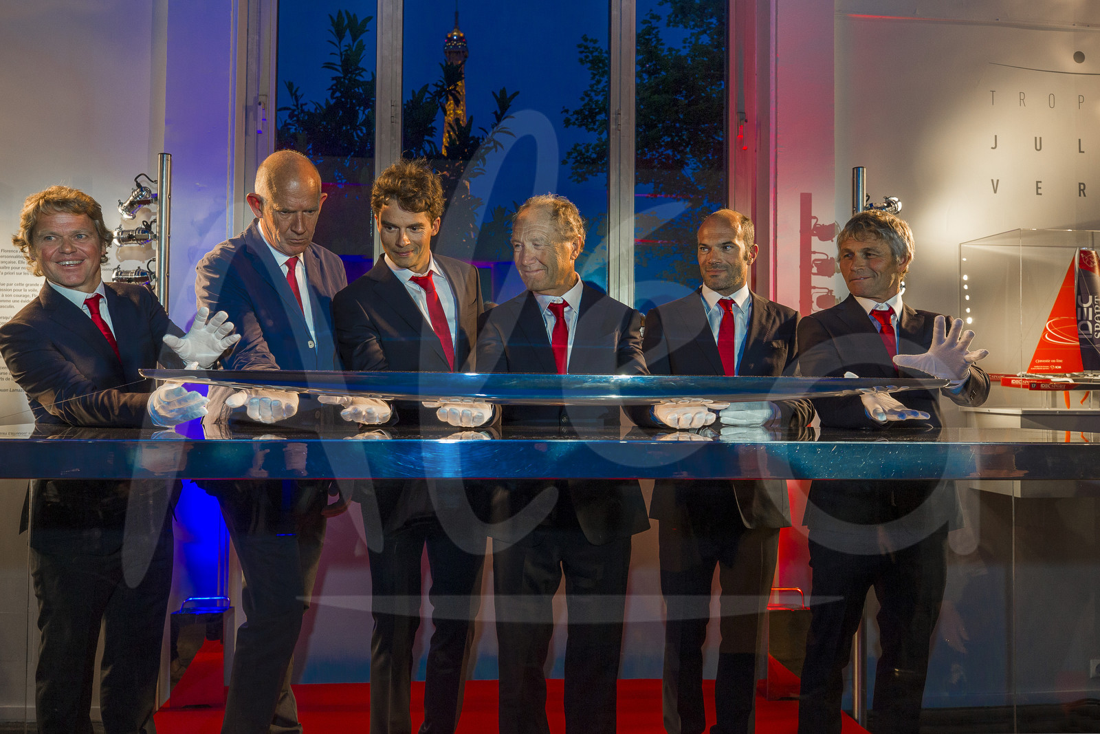 Description | Jules Verne Trophy ceremony for record holder maxi trimaran IDEC Sport and her crew, Alex Pella, Marcel Van Triest (Weatherman), Gwenole Gahinet, skipper Francis Joyon, Clement Surtel, Bernard Stamm, installing trophy on magnetic suspension at the Marine Museum in Paris, on April 27th, 2017 - Photo Jean-Marie Liot / Alea |