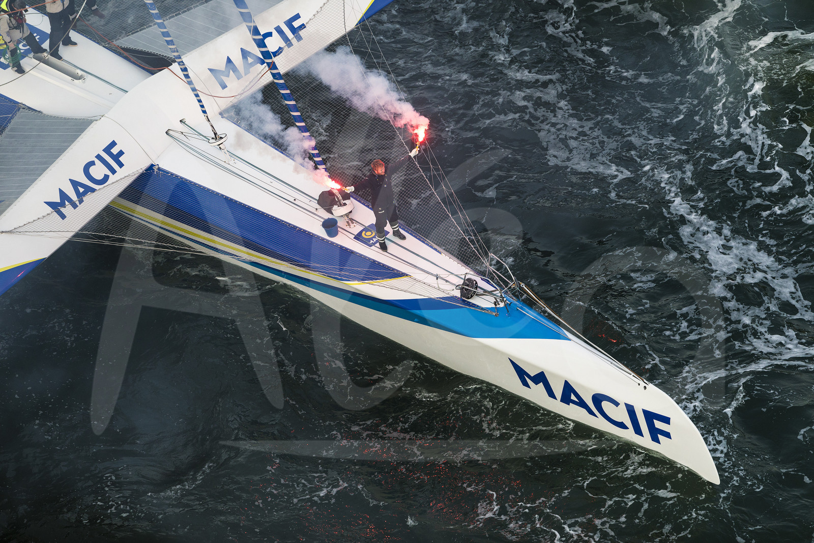 Description | Celebration with flares during Solo sailing circumnavigation record for Trimaran MACIF, skipper Francois Gabart, in 42d 16h 40mn 35s in Brest, France, on December 17th, 2017 - Photo Jean-Marie Liot / ALeA / Macif |