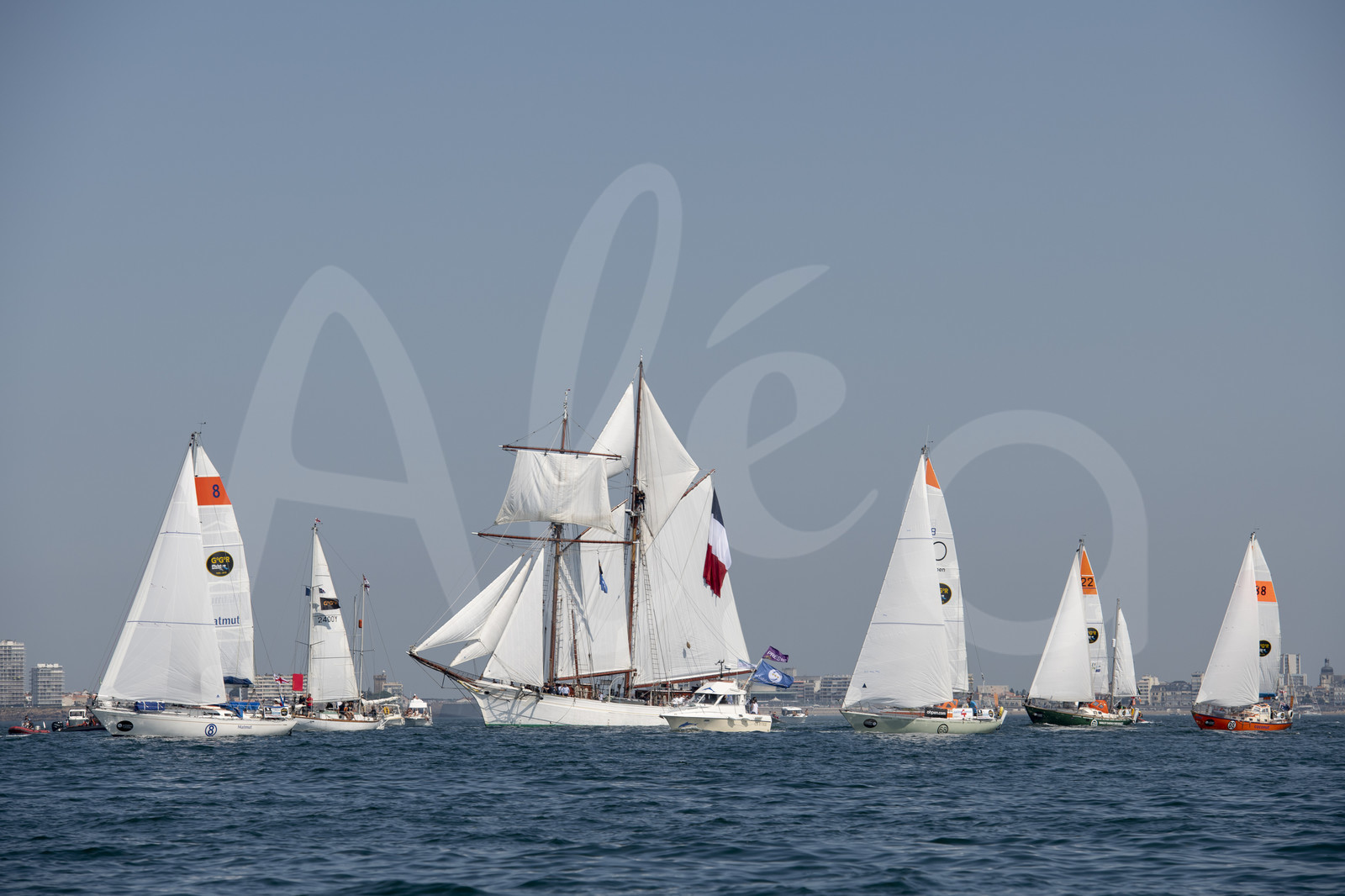 Description | Golden Globe Race Start - fleet with old ship La Belle Poule in the background, in Les Sables d'Olonne, France, on July 1st, 2018 - Photo Olivier Blanchet / AleA |