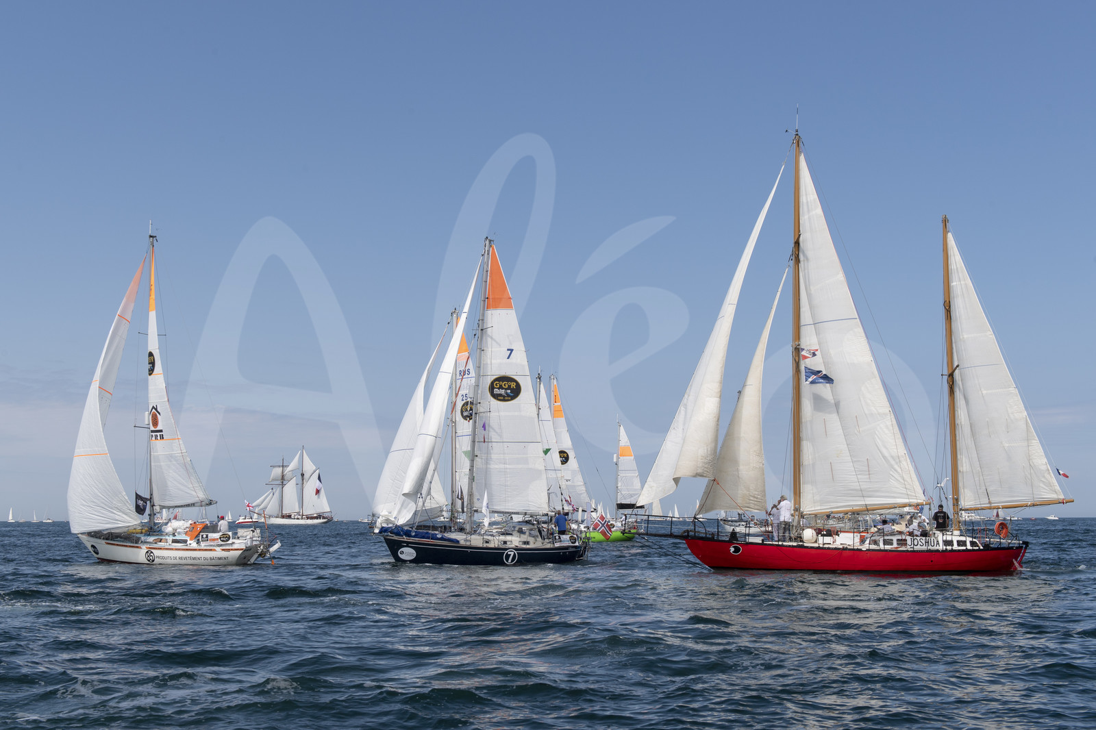 Description | Golden Globe Race Start - guest boat Joshua, skipped by Bernard Moitessier in 1968, in Les Sables d'Olonne, France, on July 1st, 2018 - Photo Olivier Blanchet / AleA |