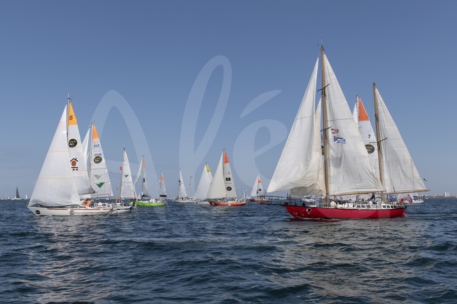 Description | Golden Globe Race Start - guest boat Joshua, skipped by Bernard Moitessier in 1968, in Les Sables d'Olonne, France, on July 1st, 2018 - Photo Olivier Blanchet / AleA |
