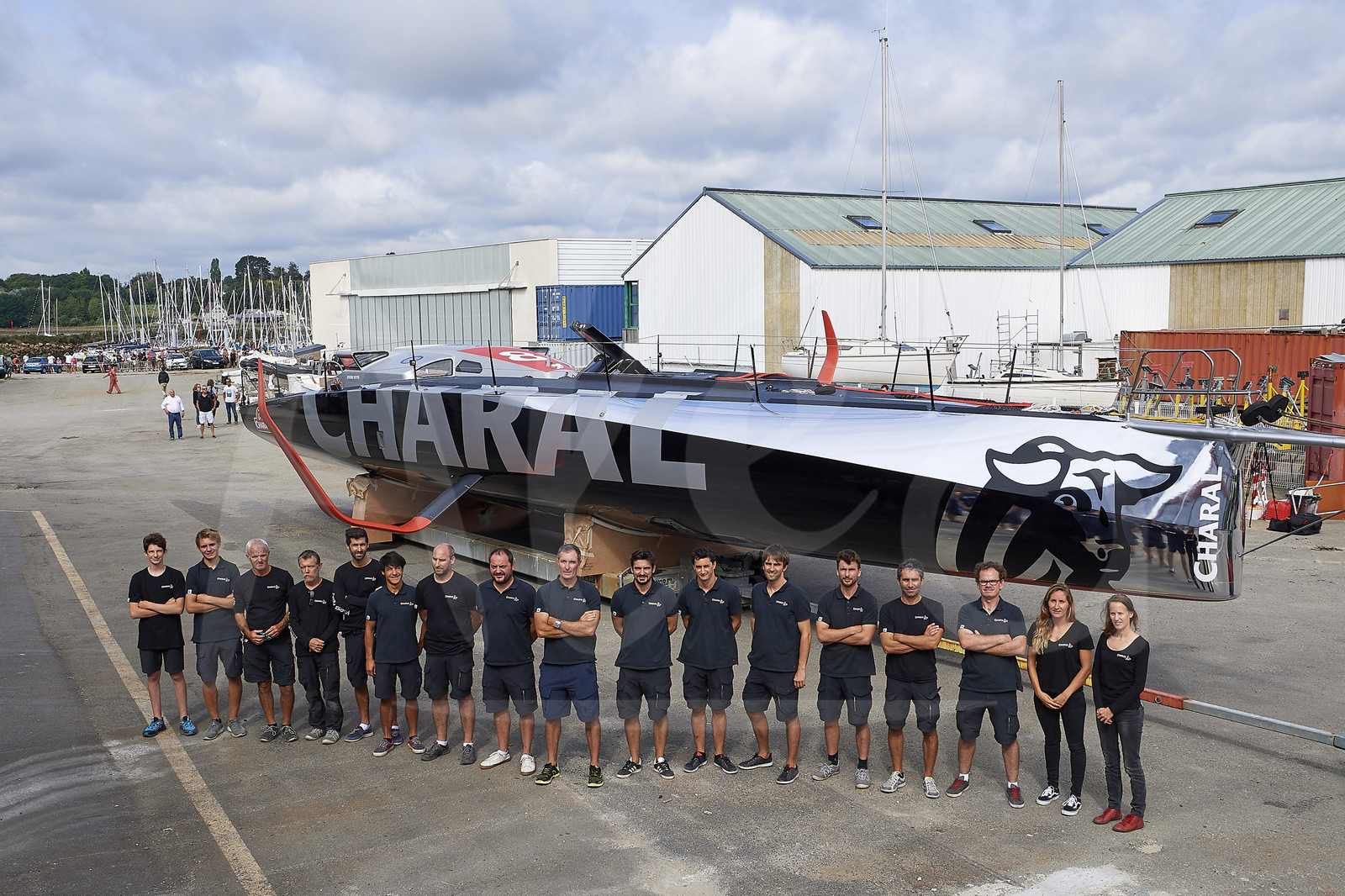 Description | Charal Sailing Team during reveal of the new IMOCA CHARAL, skipper Jeremie BEYOU, at CDK shipyard in Port La Foret (France), on August 21st, 2018 - Photo Yvan Zedda / Alea |
