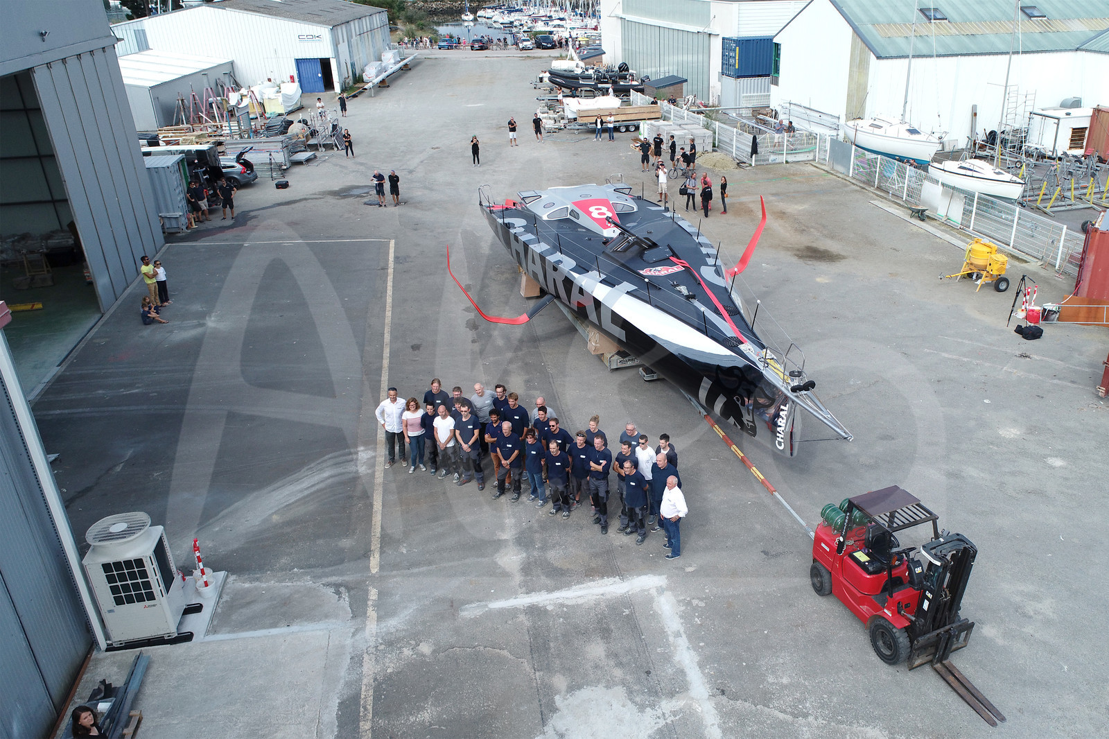 Description | Reveal of the new IMOCA CHARAL, skipper Jeremie BEYOU, at CDK shipyard in Port La Foret (France), on August 21st, 2018 - Photo Martin Keruzore / Alea |