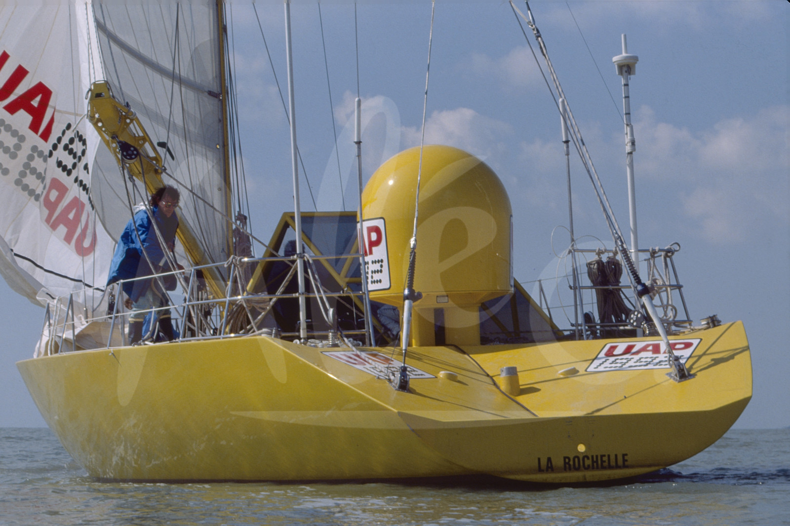 Description | French skipper Jean-Yves TERLAIN, UAP 1992, before start of the sailing round-the-world yacht race Vendee Globe, first edition, on November 26th, 1989 © Henri Thibault / Alea |