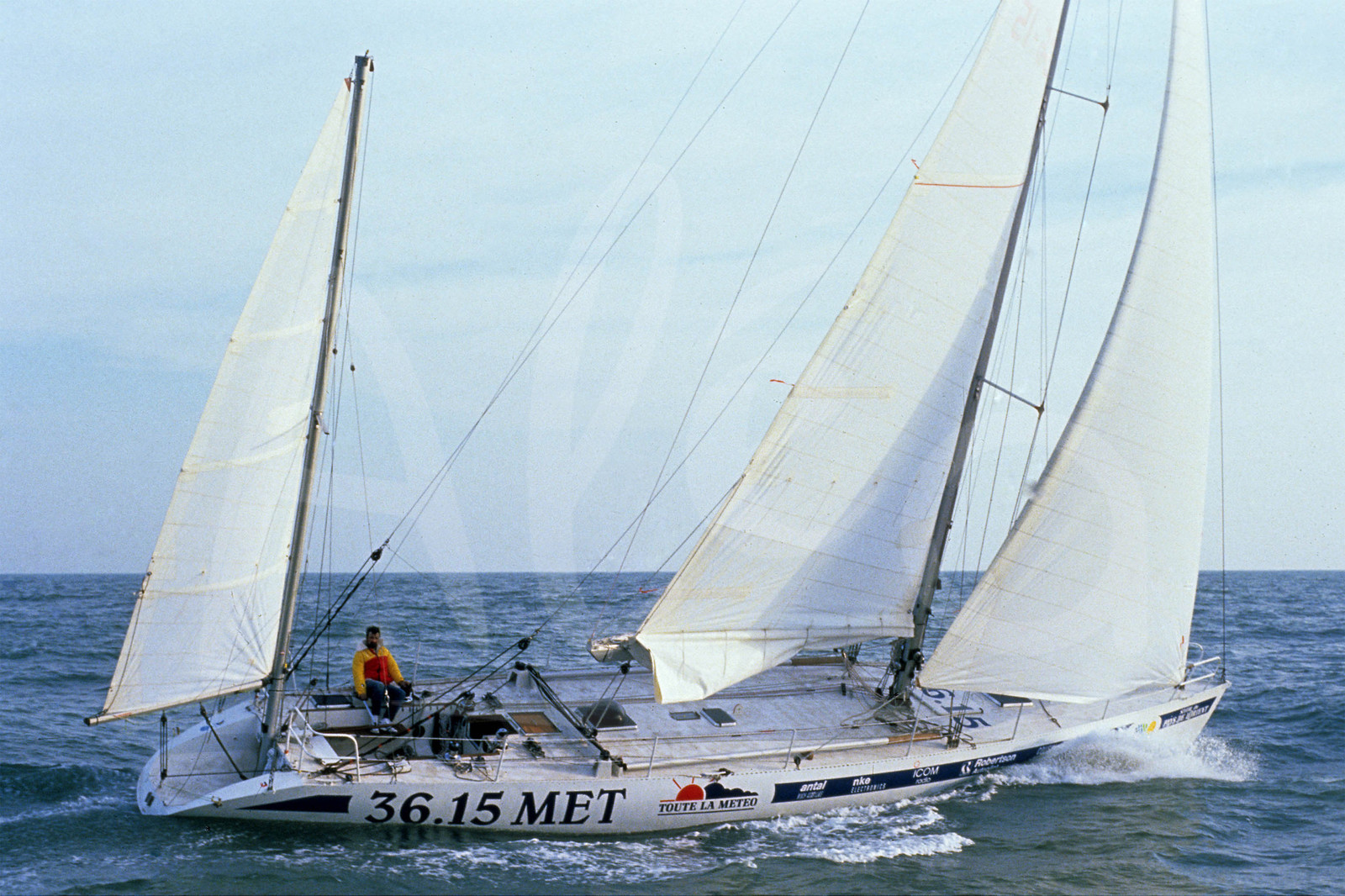 | Description | Skipper Jean-Luc Van den Heede onboard 3615 MET training off Les Sables d'Olonne before the start of the sailing round-the-world yacht race Vendee Globe, first edition, in October 1989 © Frederic Clement / Alea |