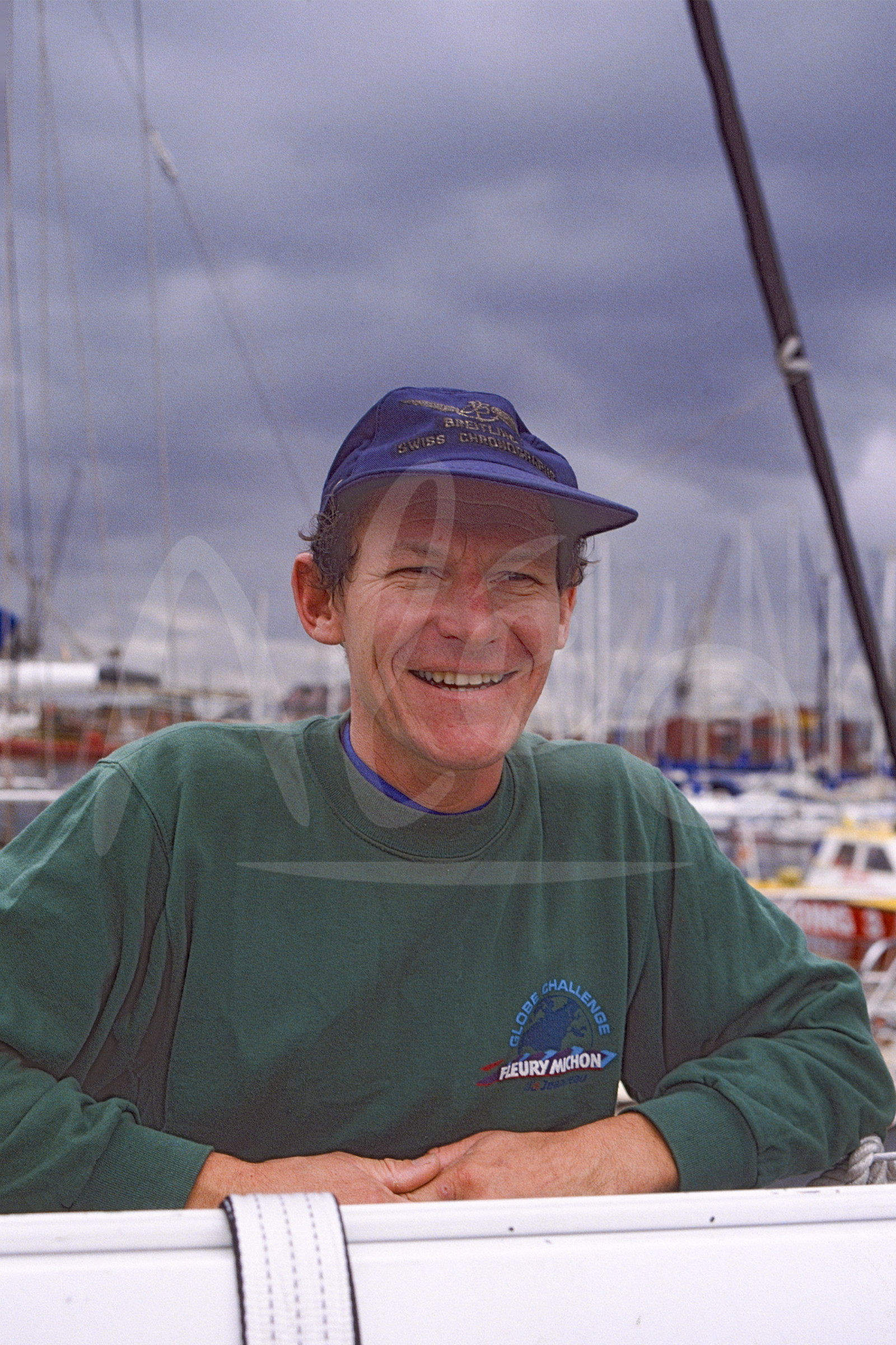 Description | Philippe POUPON explanation in Cape Town, South Africa, after capsizing with his IMOCA boat Fleury Michon X while sailing round-the-world yacht race Vendee Globe and being rescued by fellow competitor Loick PEYRON, on December 29th, 1989 - © Bernard Rubinstein / Alea |