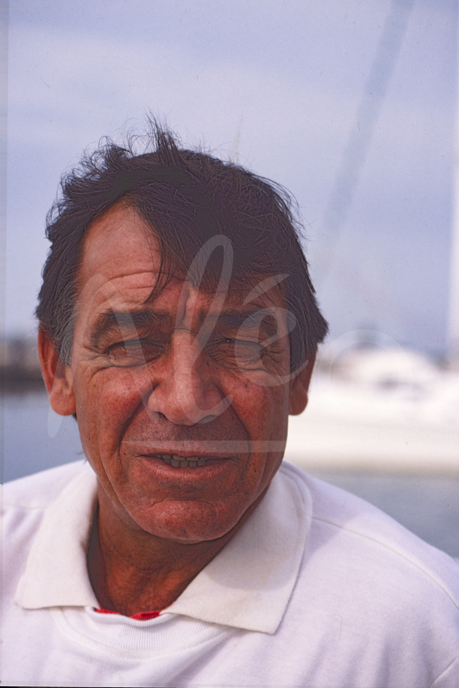 Description | Portrait of Bertie REED, South African skipper of IMOCA boat Grinaker, before start of the sailing round-the-world yacht race Vendee Globe, first edition, on November 26th, 1989 © Bernard Rubinstein / Alea |