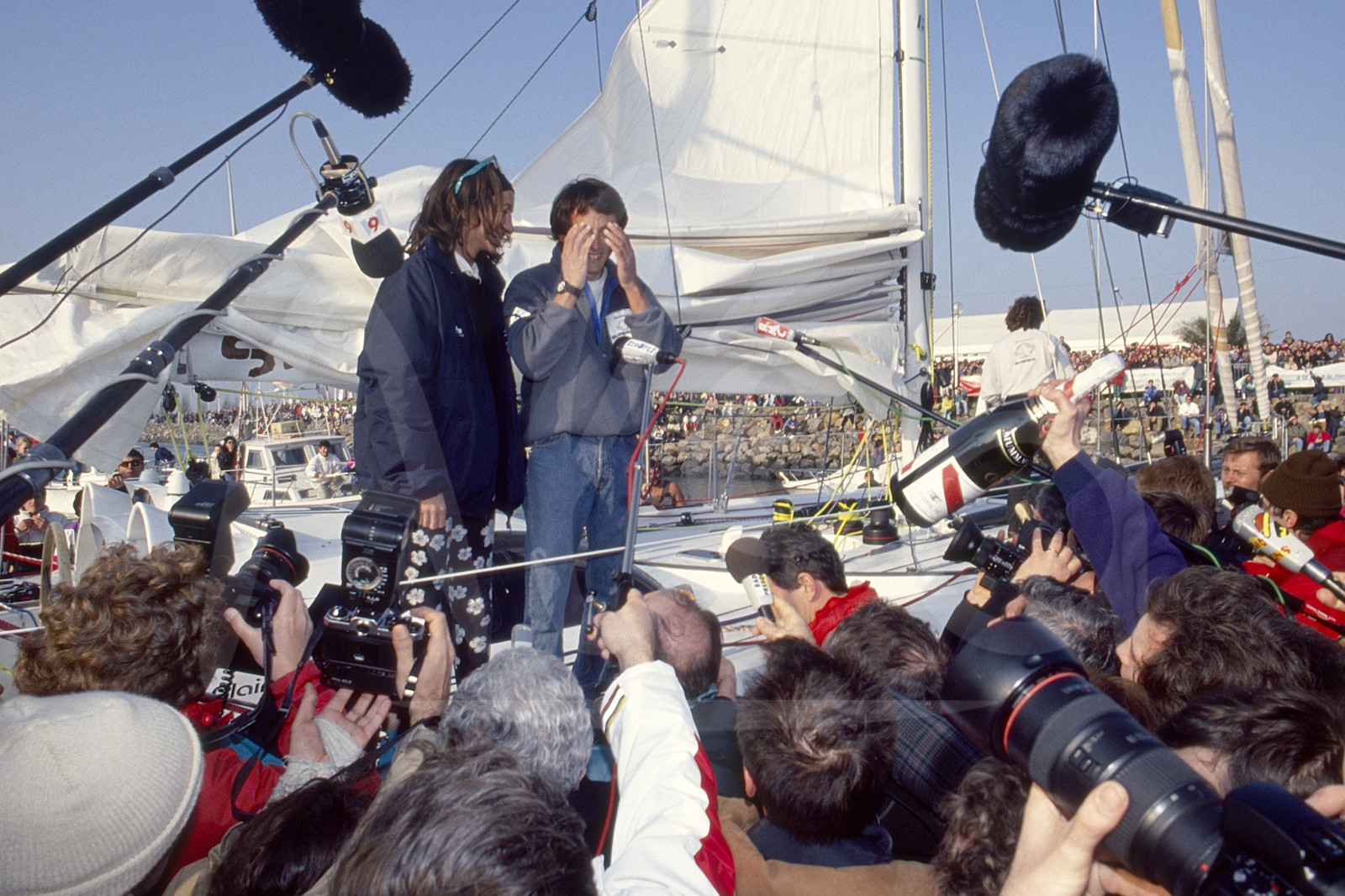 Description | Celebration for winner Alain GAUTIER, Bagages Superior, in the channel after crossing the finish line of the round-the-world solo sailing yacht race Vendee Globe in Les Sables d'Olonne, West France, on March 13th, 1993, in 110d 02h 22mn 35s - © Bernard Rubinstein / Alea |