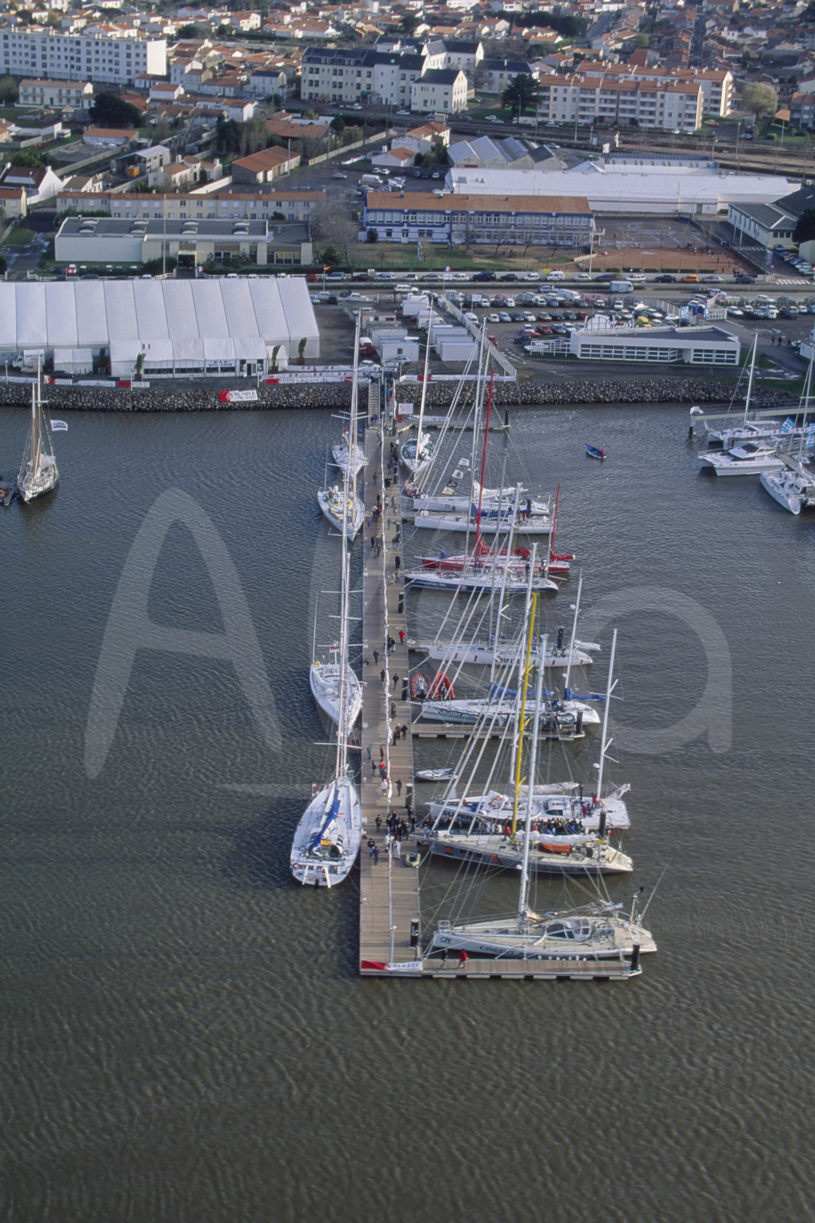 Description | Aerial view of the boats at pontoon before start of the round-the-world solo sailing yacht race Vendee Globe in Les Sables d'Olonne, West France, on November 22nd, 1992 - © Jacques Vapillon / Alea |