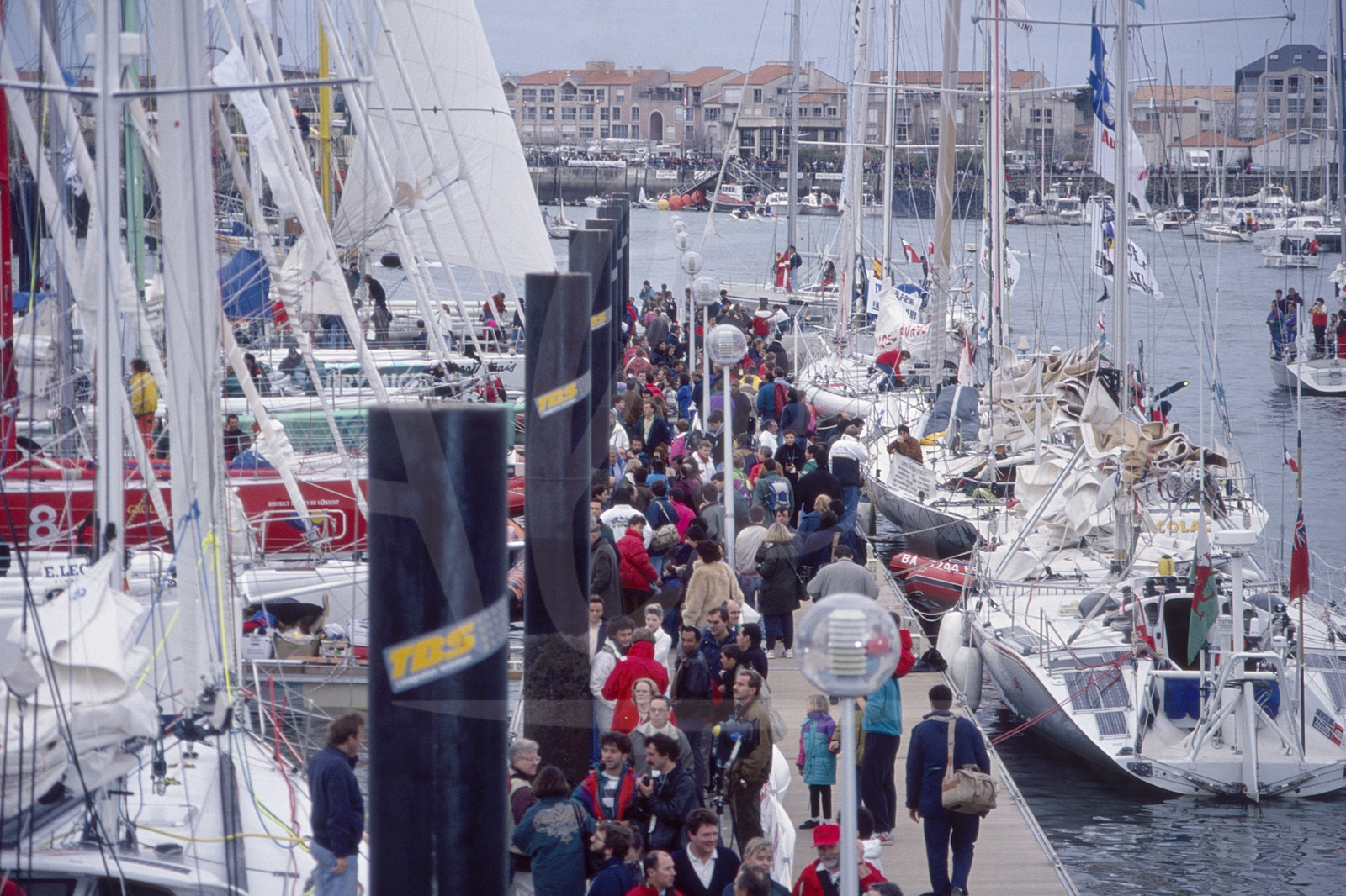 Description | Illustration of the pontoons before start of the round-the-world solo sailing yacht race Vendee Globe in Les Sables d'Olonne, West France, on November 22nd, 1992 - © Bernard Rubinstein / Alea |