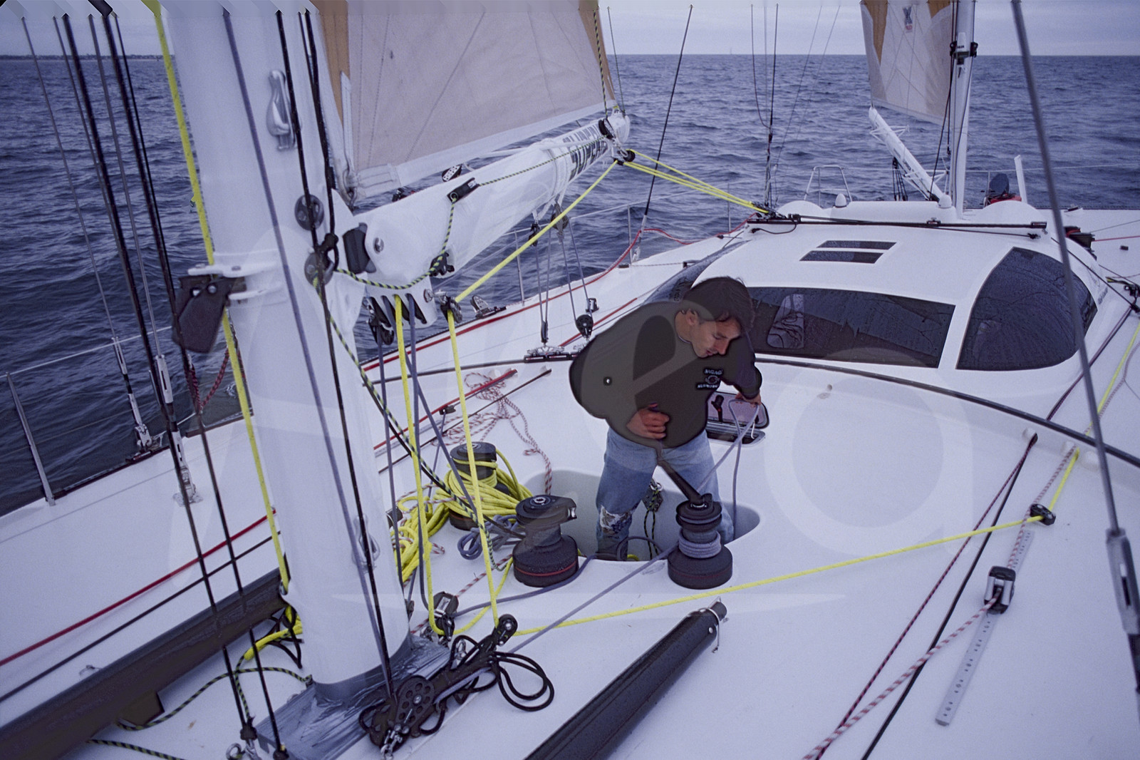Description | French skipper Alain GAUTIER, Bagages Superior, training for the solo circumnavigation sailing race Vendee Globe, 2nd edition in 1992, starting from Les Sables d'Olonne, France - © Bernard Rubinstein / Alea |