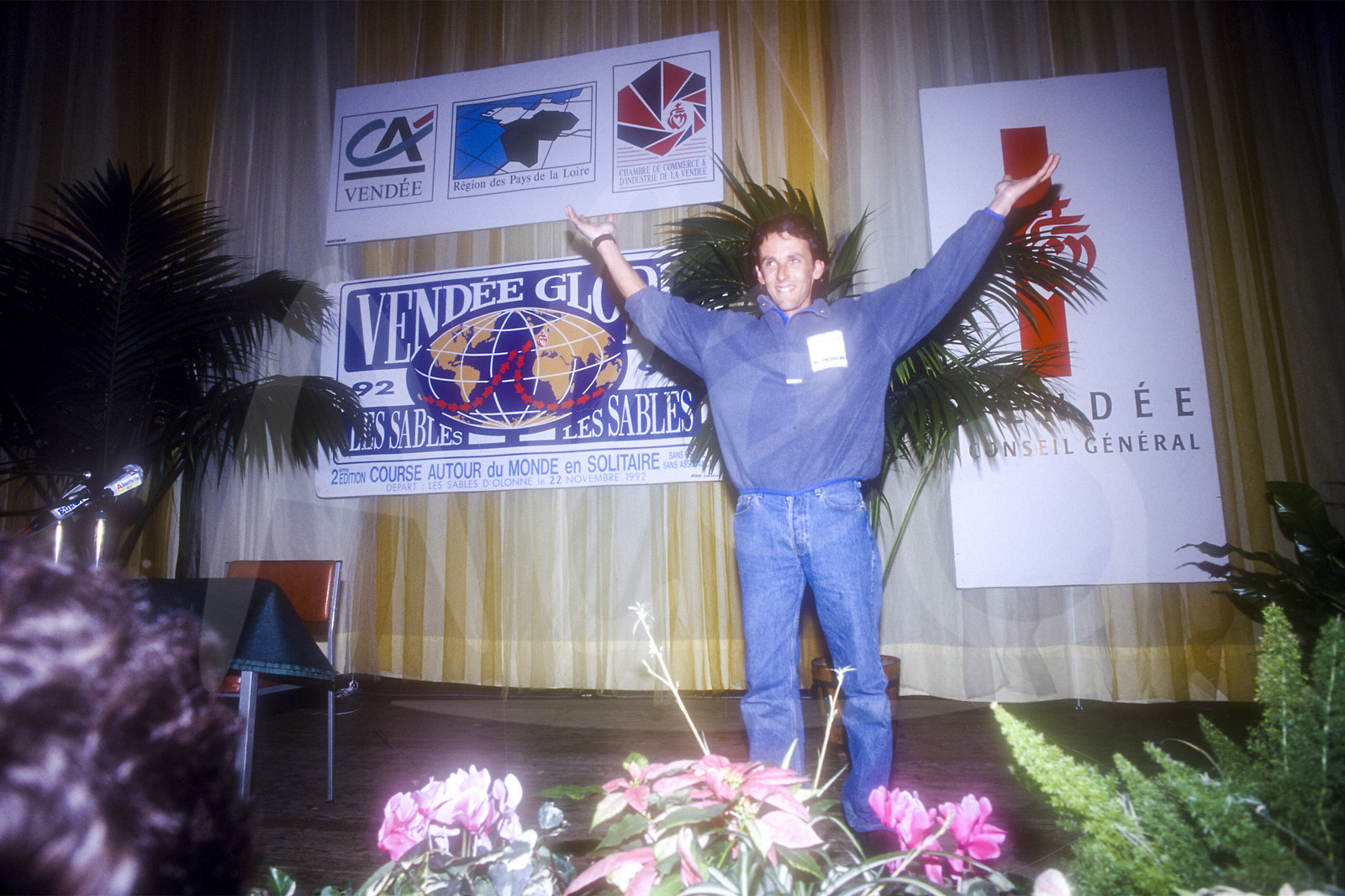 | Description | French skipper Alain Gautier portraited in Les Sables-d'Olonne, western France on March 12, 1993 after his victory in the second Vendee Globe solo round-the-world-race - Photo Bernard Rubinstein / ALEA |