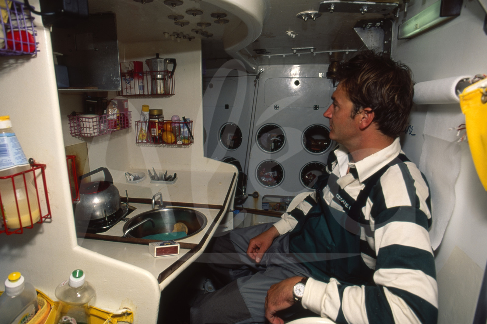 | Description | Bertrand de BROC, Groupe LG, at his cook area during training for the round-the-world solo sailing yacht race Vendee Globe in La Baule, West France, on November, 1992 - © Bernard Rubinstein / Alea |