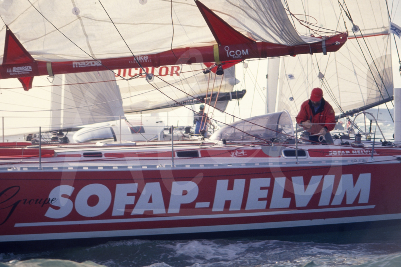 Description | Jean-Luc VAN DEN HEEDE, Groupe Sofap Helvim, during start of the round-the-world solo sailing yacht race Vendee Globe in Les Sables d'Olonne, West France, on November 22nd, 1992 - © Bernard Rubinstein / Alea |