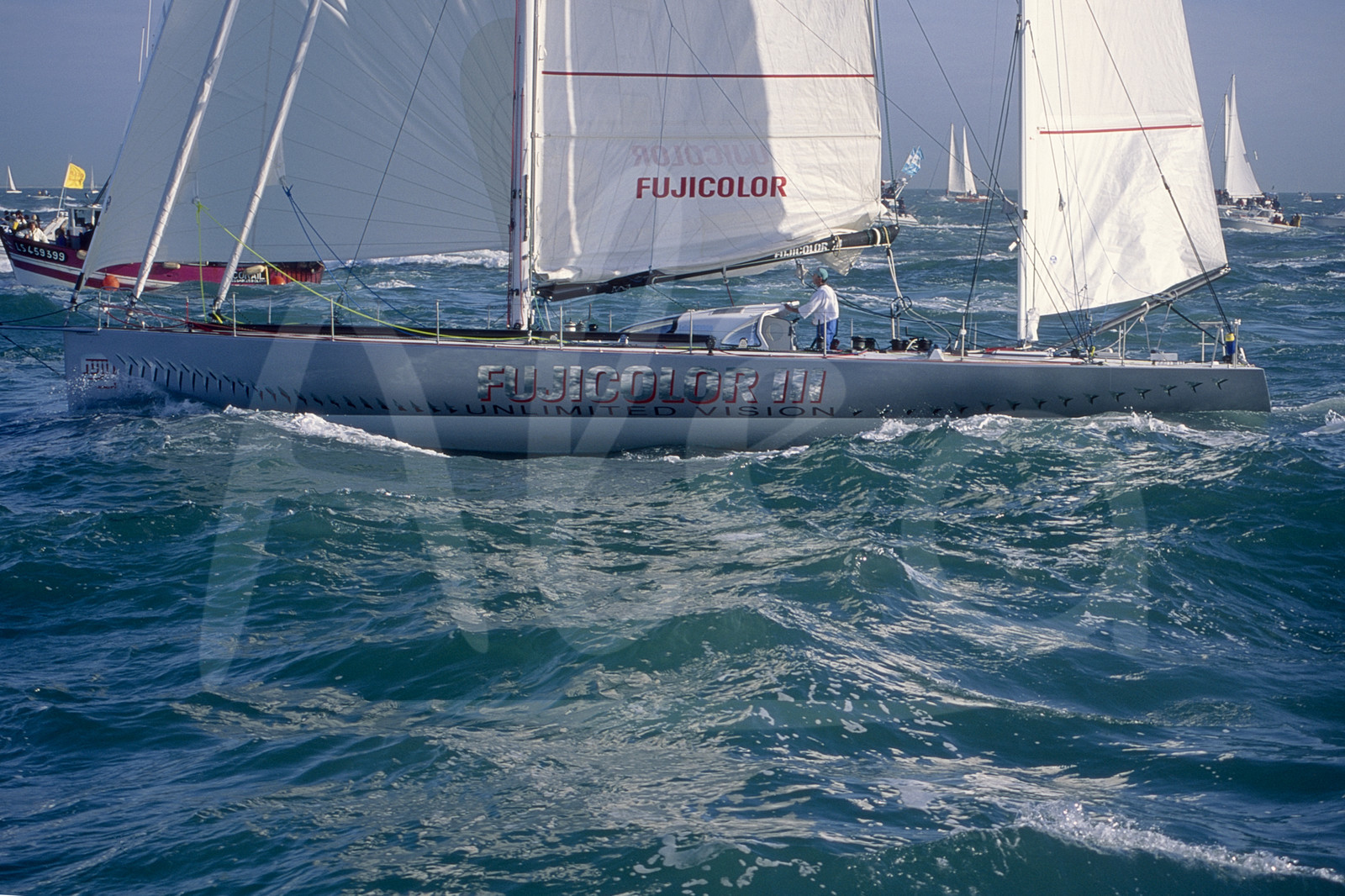 | Description | Loick PEYRON, Fujicolor III, during start of the round-the-world solo sailing yacht race Vendee Globe in Les Sables d'Olonne, West France, on November 22nd, 1992 - © Bernard Rubinstein / Alea |