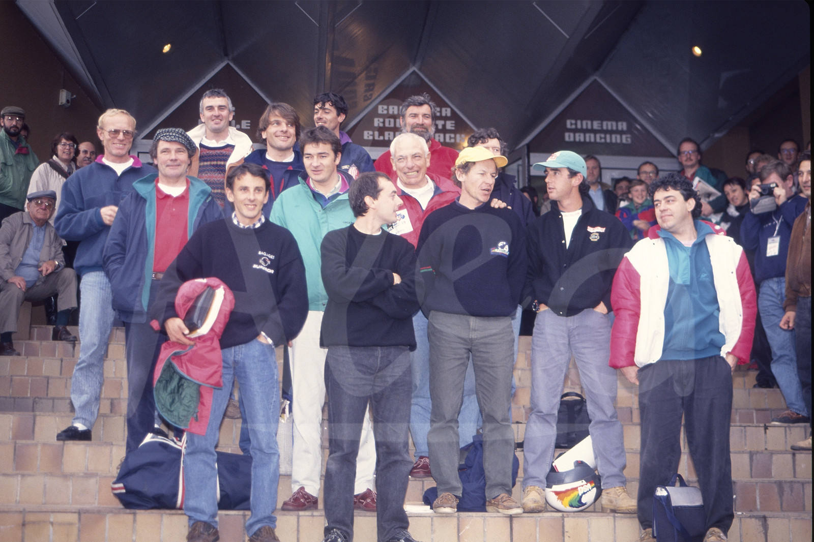 Description | All skippers from left to right and up to down, Yves PARLIER, Vittorio MALLINGRI, Jean-Luc VAN DEN HEEDE, Nandor FA, Bernard GALLAY, Nigel BURGESS, Alan WYNNE-THOMAS, Bertrand de BROC, Jose de UGARTE, Philippe POUPON, Loick PEYRON, Alain GAUTIER, Thierry ARNAUD, Jean-Yves HASSELIN, before start of the round-the-world solo sailing yacht race Vendee Globe in Les Sables d'Olonne, West France, on November 21st, 1992 - © Bernard Rubinstein / Alea |