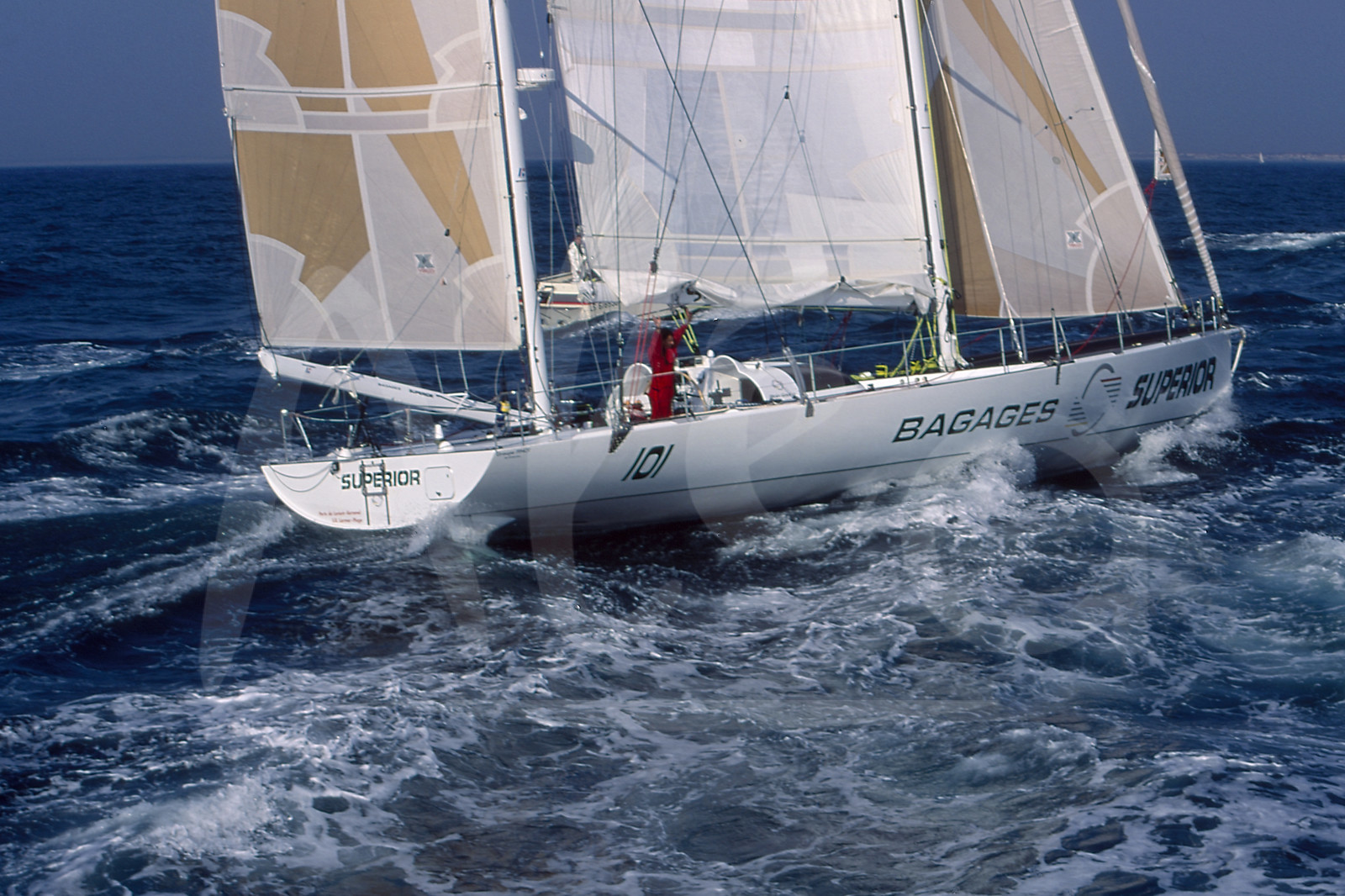 Description | Winner Alain GAUTIER, Bagages Superior, on the finish line of the round-the-world solo sailing yacht race Vendee Globe in Les Sables d'Olonne, West France, on March 13th, 1993, in 110d 02h 22mn 35s - © Bernard Rubinstein / Alea |
