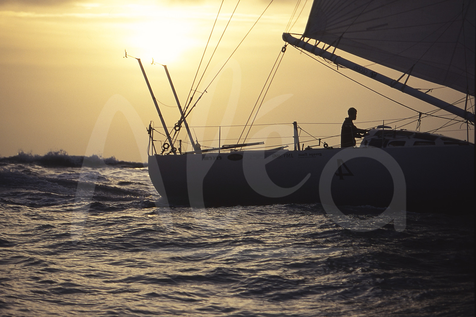 Description | Arrival of winner Christophe AUGUIN, Geodis, first of the round-the-world solo sailing yacht race Vendee Globe in Les Sables d'Olonne, West France, on February 17th, 1997 - © Bernard Rubinstein / Alea |
