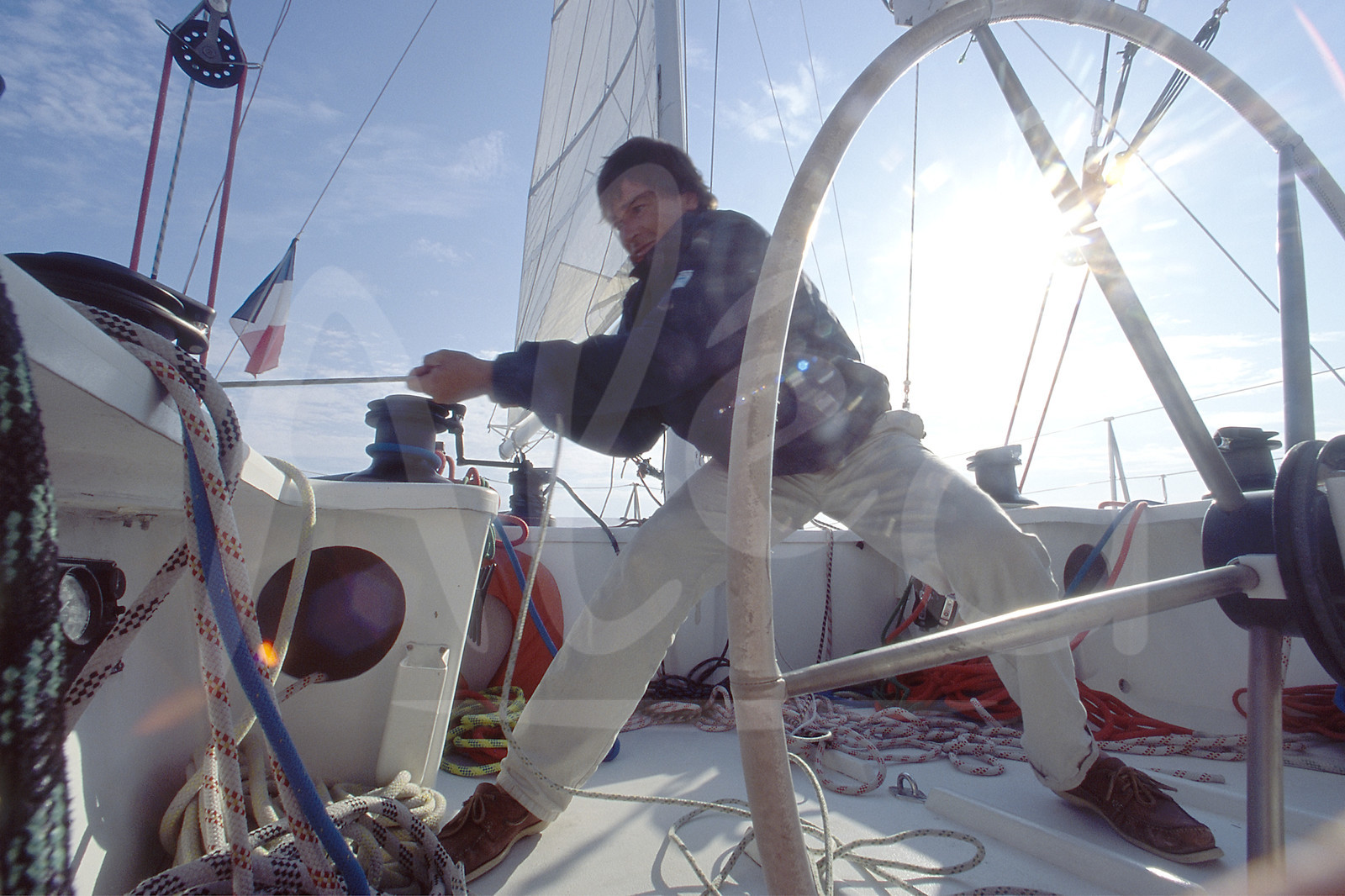 Description | Bertrand de BROC, Votre Nom Autour du Monde, training for the round-the-world solo sailing yacht race Vendee Globe in Les Sables d'Olonne, West France, on September 25th, 1996 - © Henri Thibault / Alea |
