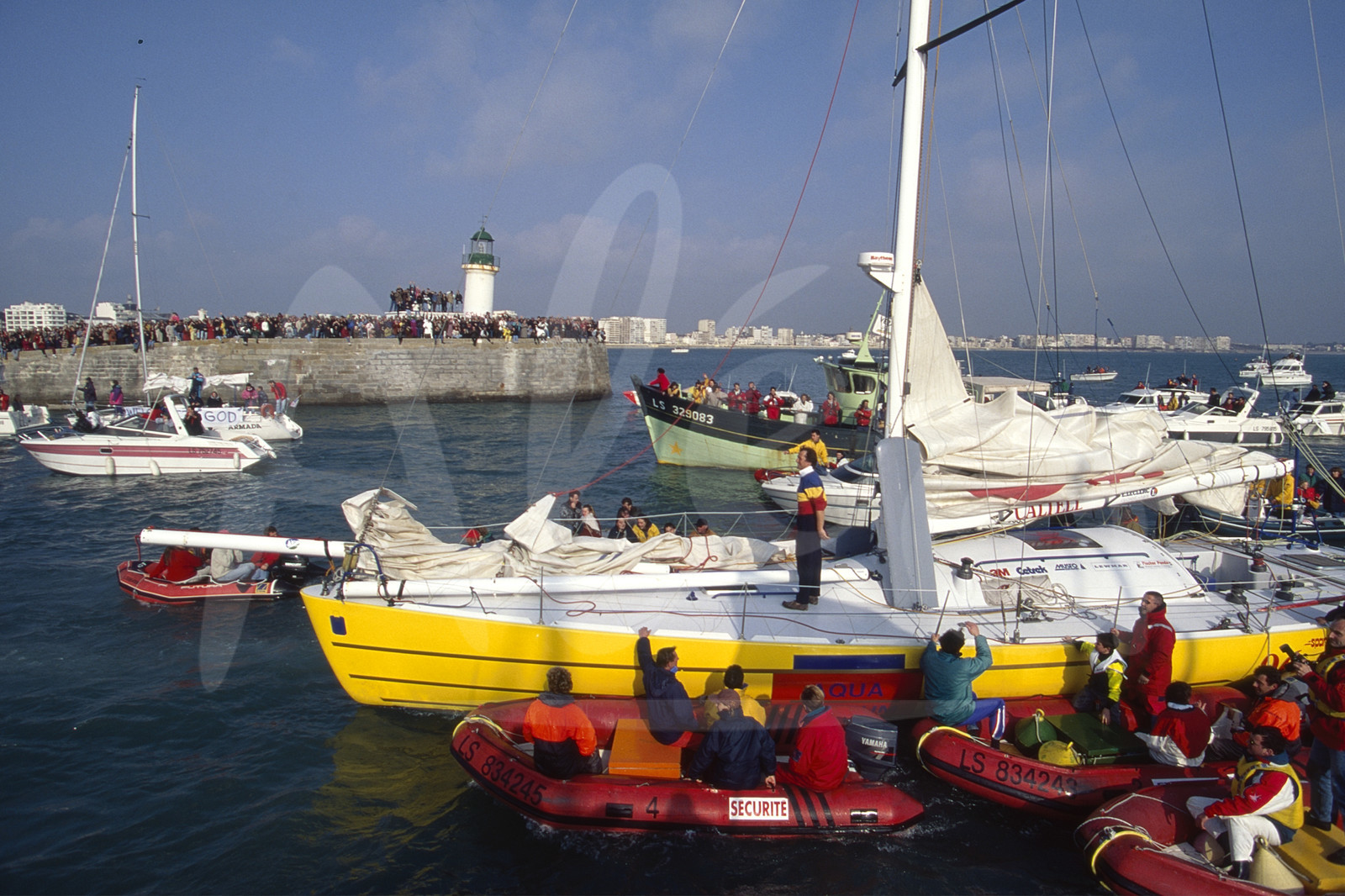 Description | Arrival of Pete GOSS, Aqua Quorum, 4th of the round-the-world solo sailing yacht race Vendee Globe in Les Sables d'Olonne, West France, on May 10th, 1997 - © Henri Thibault / Alea |