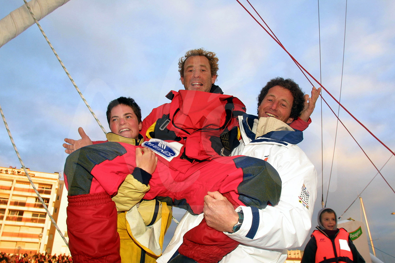 | Description | Podium for 3rd Roland Jourdain, Sill, 2nd Ellen Macarthur, Kingfisher and Winner Michel Desjoyeaux, PRB, of the solo round the world sailing race Vendee Globe, 4th edition, in Les Sables d'Olonne, on February 13th, 2001 - Photo Jacques Vapillon / ALEA . |