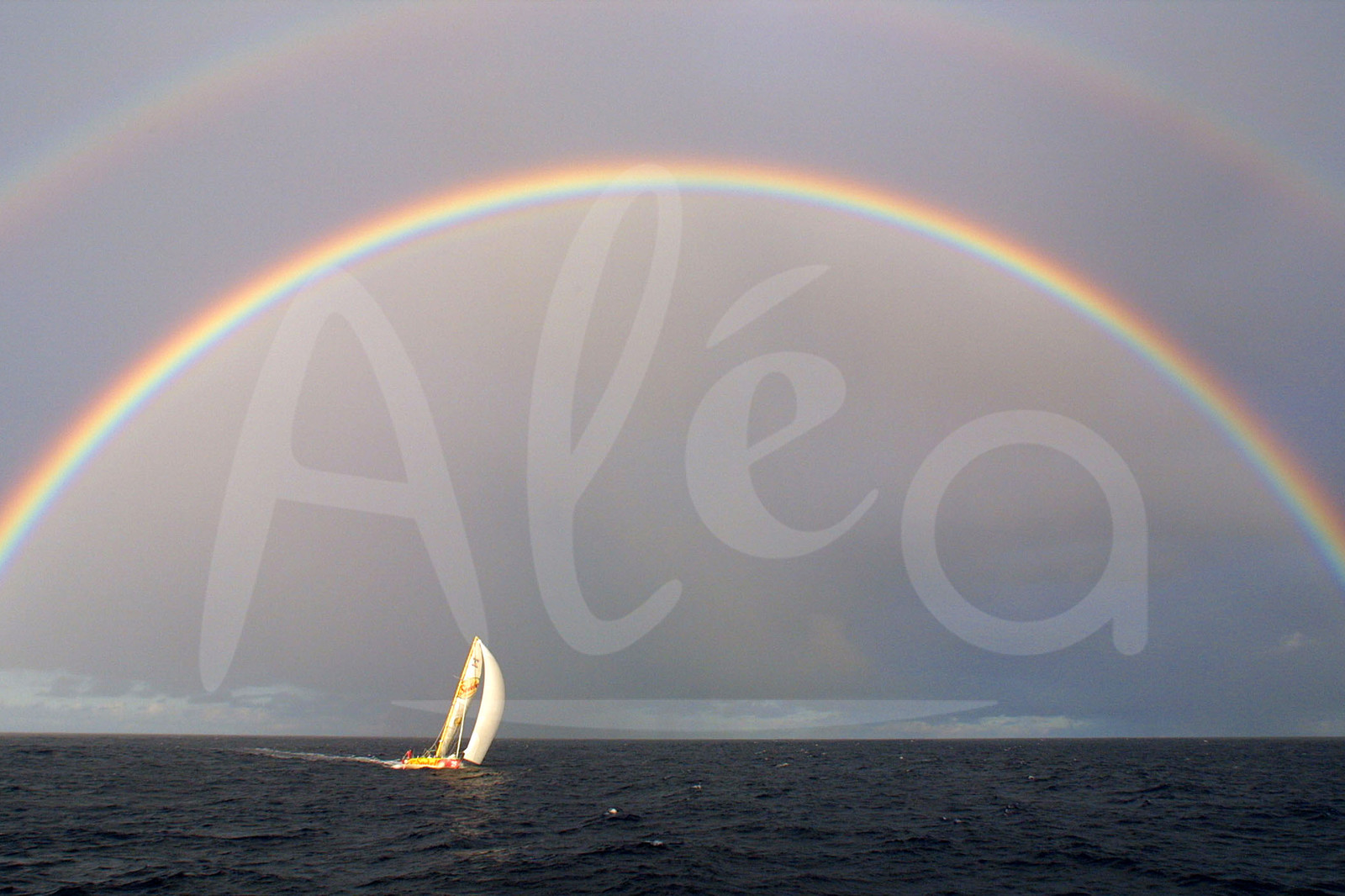 | Description | Thomas Coville, Sodebo, under a rainbow, shot from the motorboat Adventurer, sailing along the fleet during first days of the solo round the world sailing race Vendee Globe, 4th edition, in the Atlantic Ocean, on November 14th, 2000 - Photo Jacques Vapillon / ALEA . |