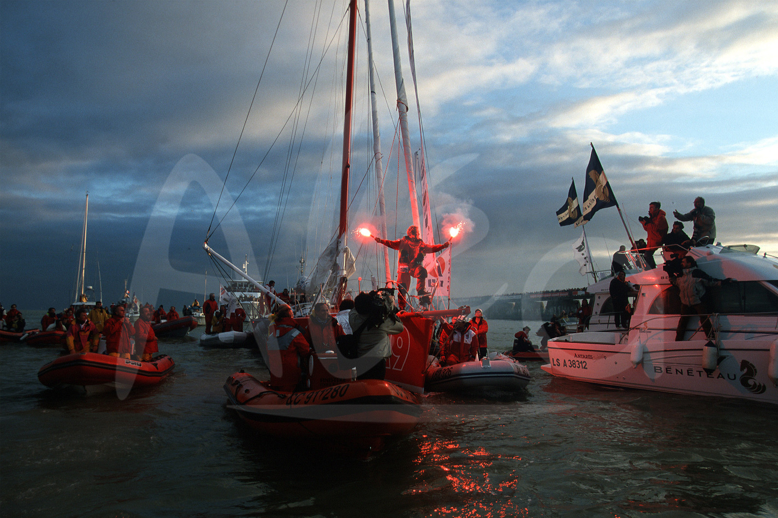 | Description | Arrival for Roland Jourdain, Sill, celebrating with flares in the channel after finishing 3rd of the solo round the world sailing race Vendee Globe, 4th edition, in Les Sables d'Olonne, on February 13th, 2001 - Photo Jean-Marie Liot / ALEA . |