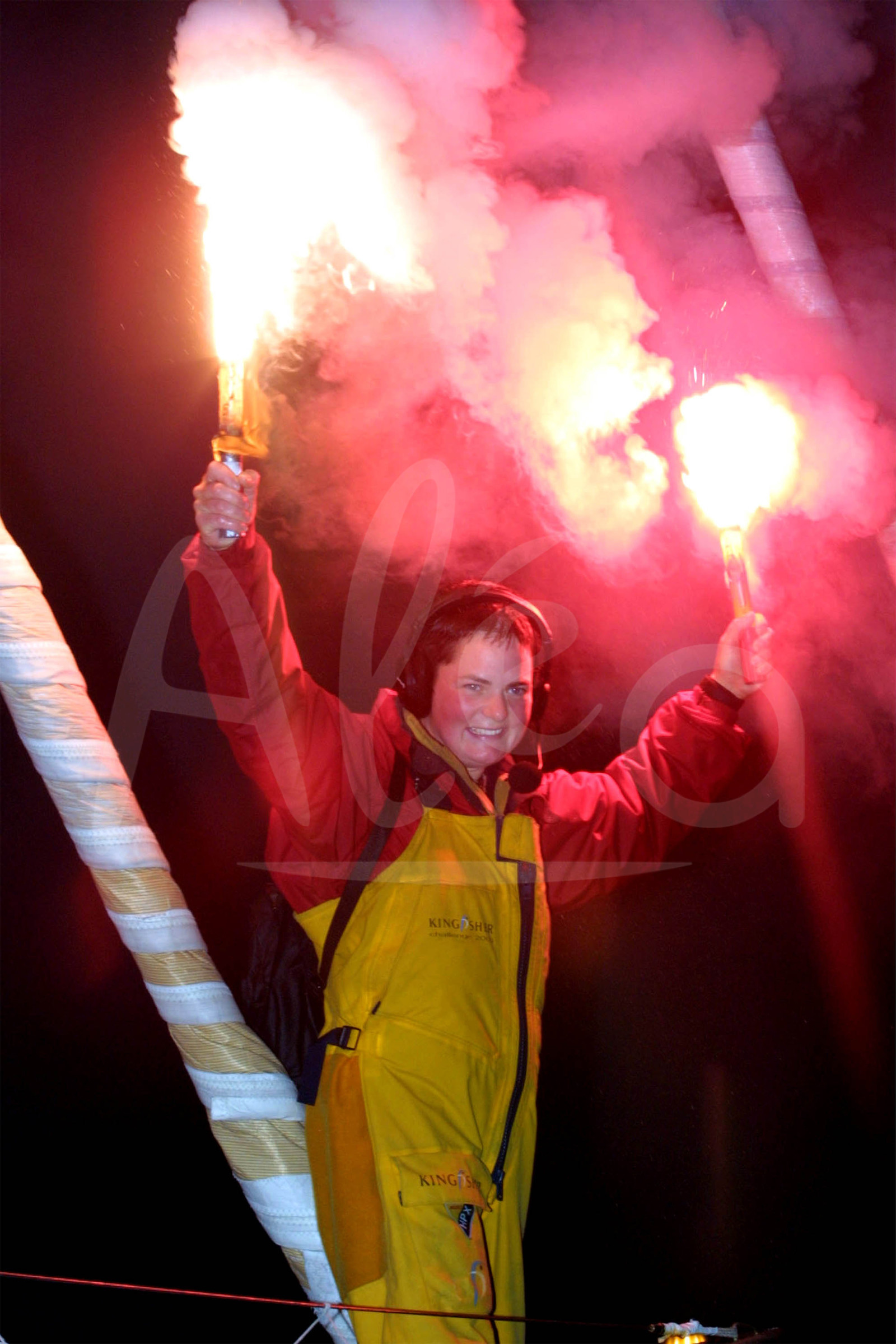 | Description | Arrival for Ellen Macarthur, Kingfisher, celebrating with flares in the channel after finishing 2nd of the solo round the world sailing race Vendee Globe, 4th edition, in Les Sables d'Olonne, on February 11th, 2001 - Photo Jean-Marie Liot / ALEA . |
