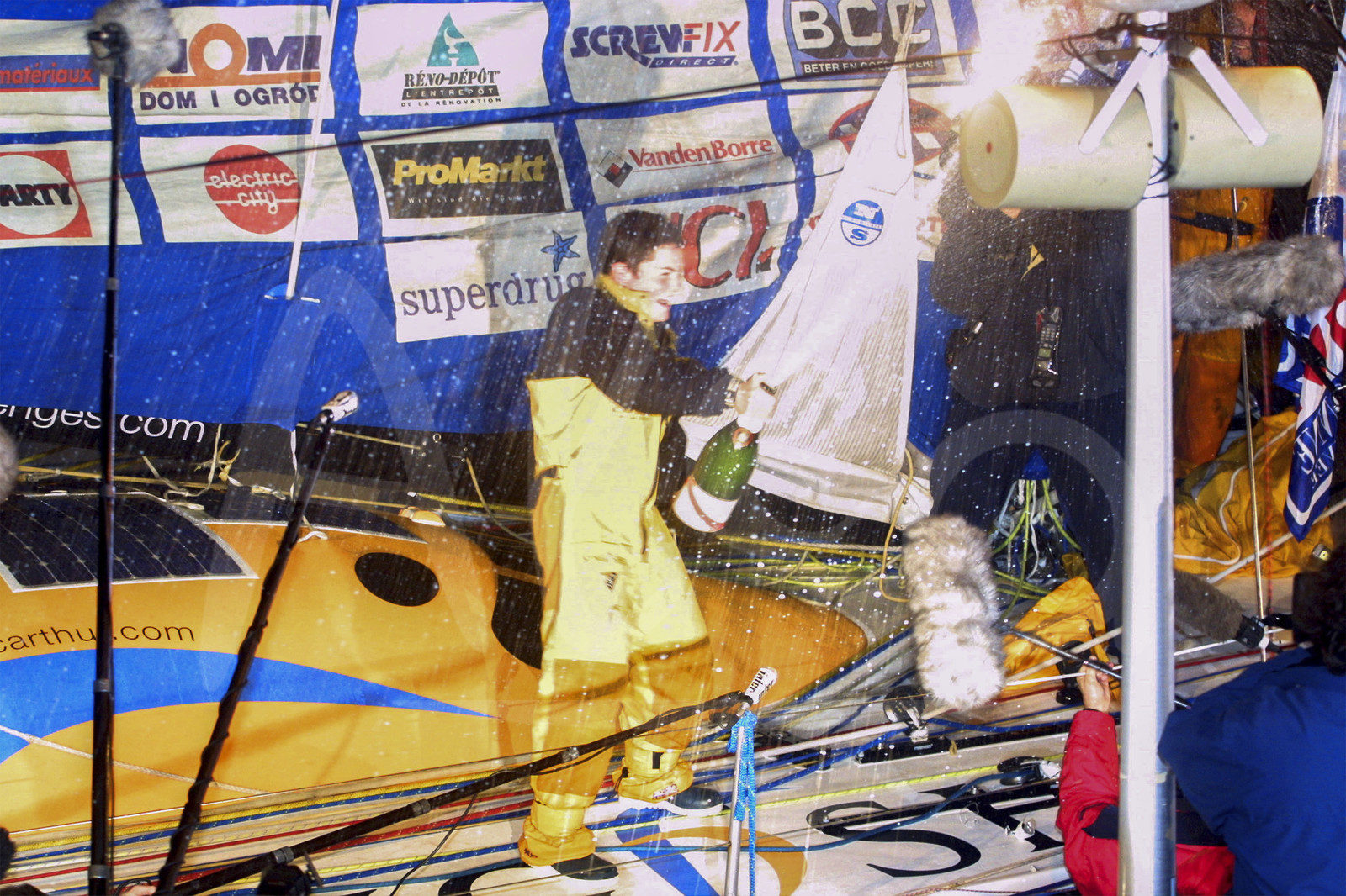 | Description | Arrival for Ellen Macarthur, Kingfisher, celebrating with Mumm champagne in the channel after finishing 2nd of the solo round the world sailing race Vendee Globe, 4th edition, in Les Sables d'Olonne, on February 11th, 2001 - Photo Jean-Marie Liot / ALEA . |