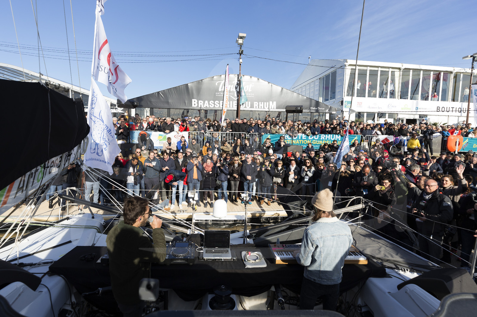 Description | Christening by the DJ "Breakbot and Irfane", godfathers of IMOCA Newrest – Arts & Fenetres, skipper Fabrice Amedeo, during the pre-start of the Route du Rhum 2018, on November 3rd, 2018 in St-Malo, north Brittany, France - Photo Jean-Marie Liot / Newrest – Arts & Fenetres |