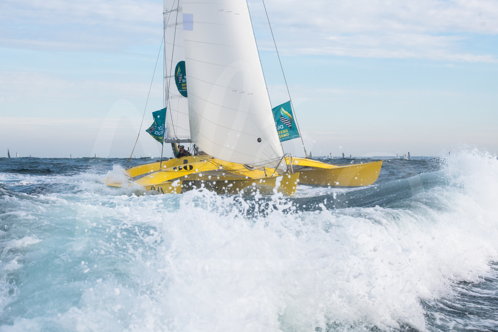 Description | rhum multi Happy, skipper Loick Peyron, during the start of the Route du Rhum 2018, on November 4th, 2018 in St-Malo, north Brittany, France - Photo Jean-Louis Carli / Alea |