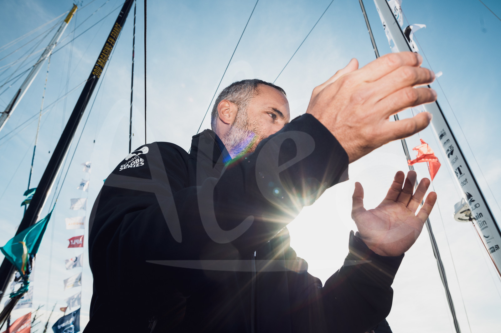 Description | Christening by the DJ "Breakbot and Irfane", godfathers of IMOCA Newrest – Arts & Fenetres, skipper Fabrice Amedeo, together with Yohann Diniz, French race walker, during the pre-start of the Route du Rhum 2018, on November 3rd, 2018 in St-Malo, north Brittany, France - Photo Jean-Louis Carli / Alea |
