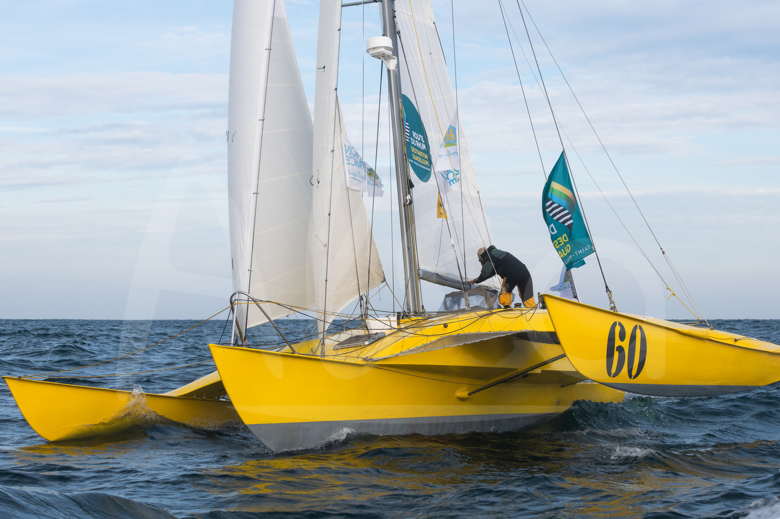 Description | rhum multi Happy, skipper Loick Peyron, during the start of the Route du Rhum 2018, on November 4th, 2018 in St-Malo, north Brittany, France - Photo Jean-Louis Carli / Alea |