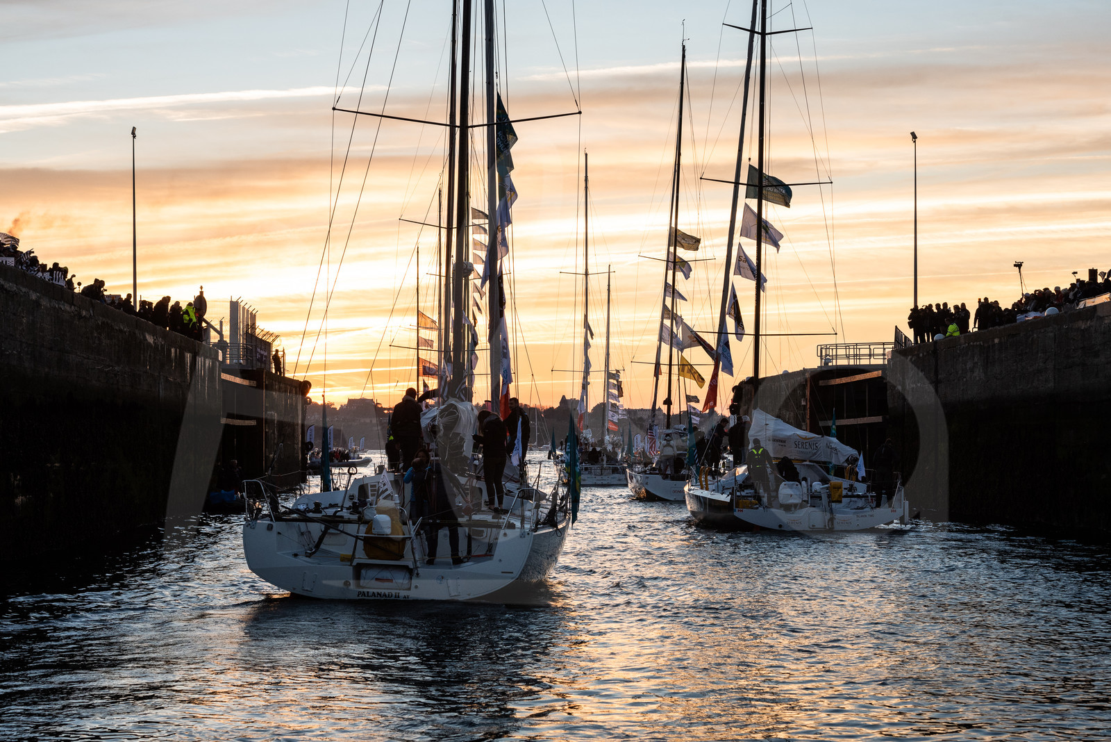 Description | General view of the public while class 40 are leaving pontoons to pass a lock towards moorings, they will spend the night before the start of the Route du Rhum 2018, on November 3rd, 2018 in St-Malo, north Brittany, France - Photo Jean-Louis Carli / Alea |