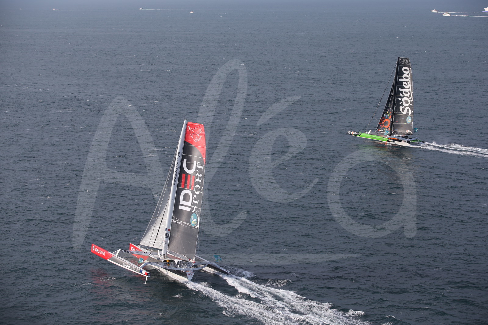 Description | ultime IDEC Sport and Sodebo Ultim', during start of the Route du Rhum 2018, on November 4th, 2018 in St-Malo, north Brittany, France - Photo Jean-Marie Liot / Alea |
